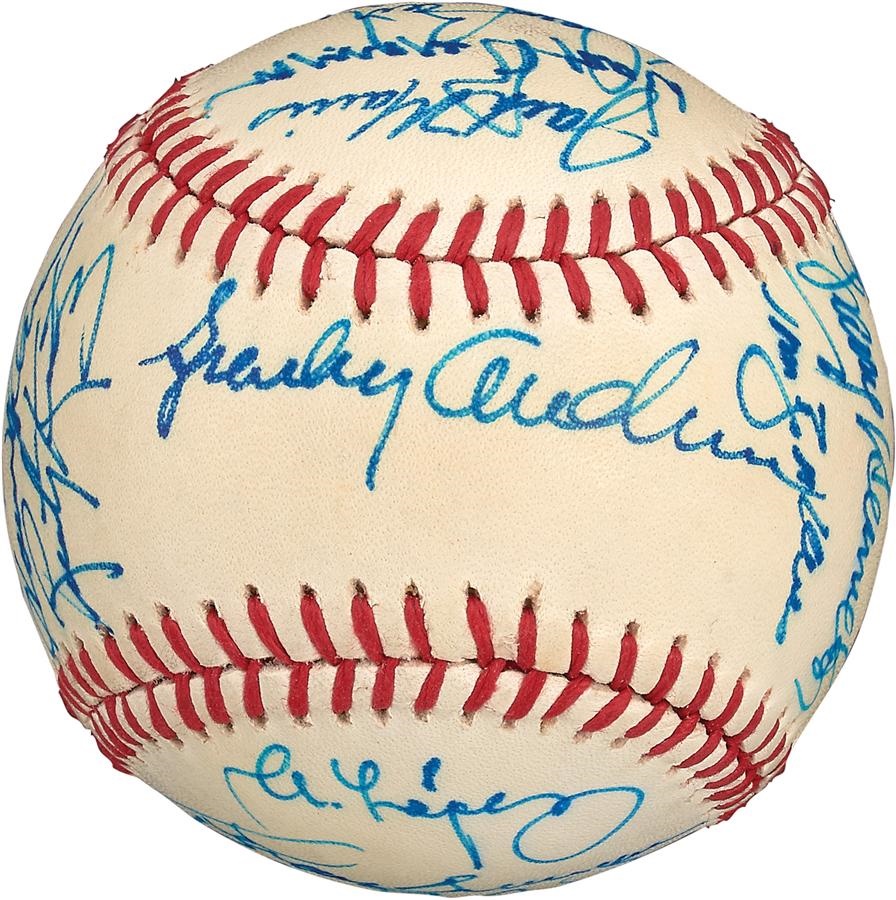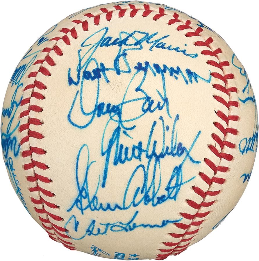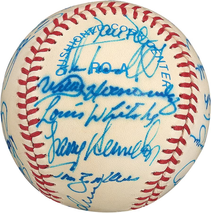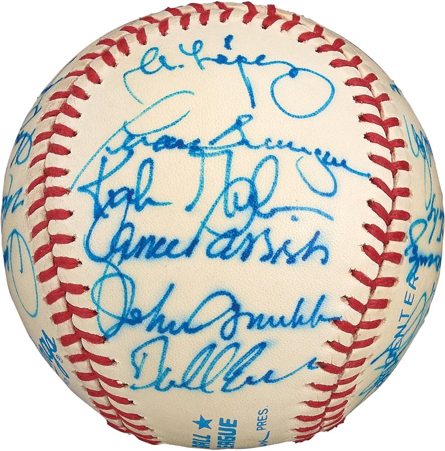 Boy, could those Bengals bash! The 1984 Detroit Tigers blasted out of the gate by winning 35 of their first 40 games and were never challenged en route to the World Series title. From that dominant season comes this official American League (Brown) baseball that is high grade and NRMT-plus. There are 23 signatures in blue pen averaging 7.5/10. Among the names are keys such as Anderson, Morris, Hernandez, Parrish, Tramell, Whitaker and more.