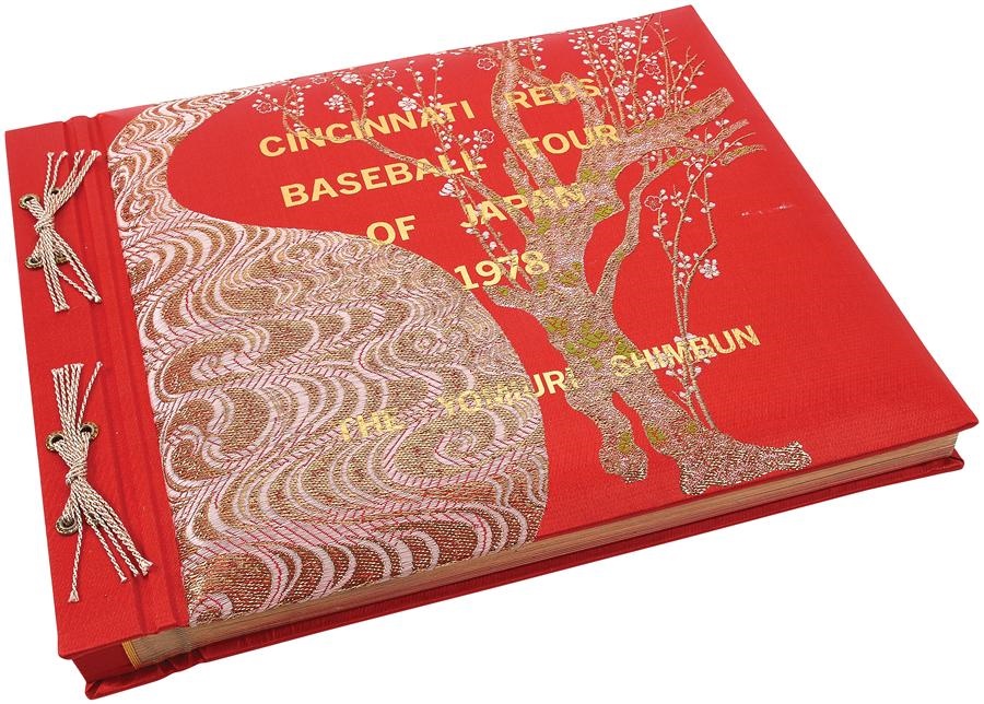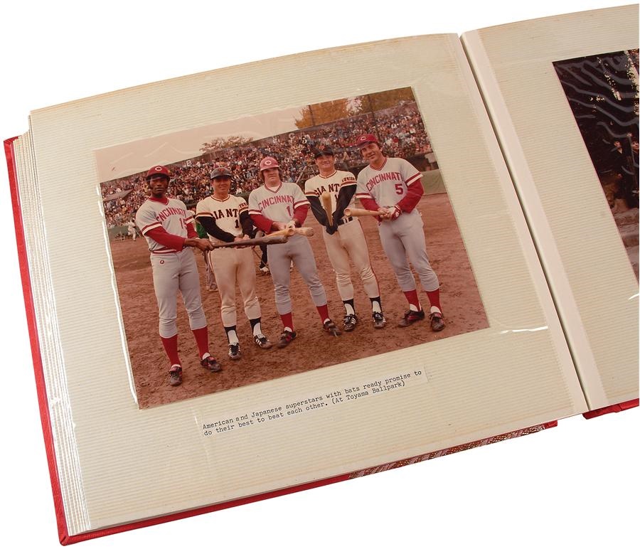 Spectacular photo album with artfully shot professional images of the Cincinnati Reds from their grounbdreaking 1978 tour was a gift to Pete Rose from the Yomiuri Shimbun. An album was given to each player on the Reds team and this one is obviously special as it was given to the star of the tour, Pete Rose. Comes with LOA from his ex-wife Karolyn Rose. Fifteen pages are packed with wonderful images on the fronts and backs of each page. Includes images of the teams, players, VIPs, stadiums, officials, Reds families, all pictured in killer color and nostalgic black and white. EX-MT condition.