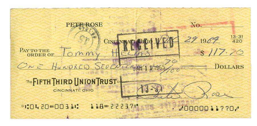 Years before he admittedly paid off bookies, Pete Rose signed off on this rare check to his teammate, Tommy Helms, and countersigned by Helms and two others. The check, issued by Fifth Third Union Trust in Rose's hometown of Cincinnati, has multiple cancellations and is in EX condition. The writing and signature grade 7/10 in blue pen. It is dated Dec. 29, 1964, after Rose's second full season in the majors.