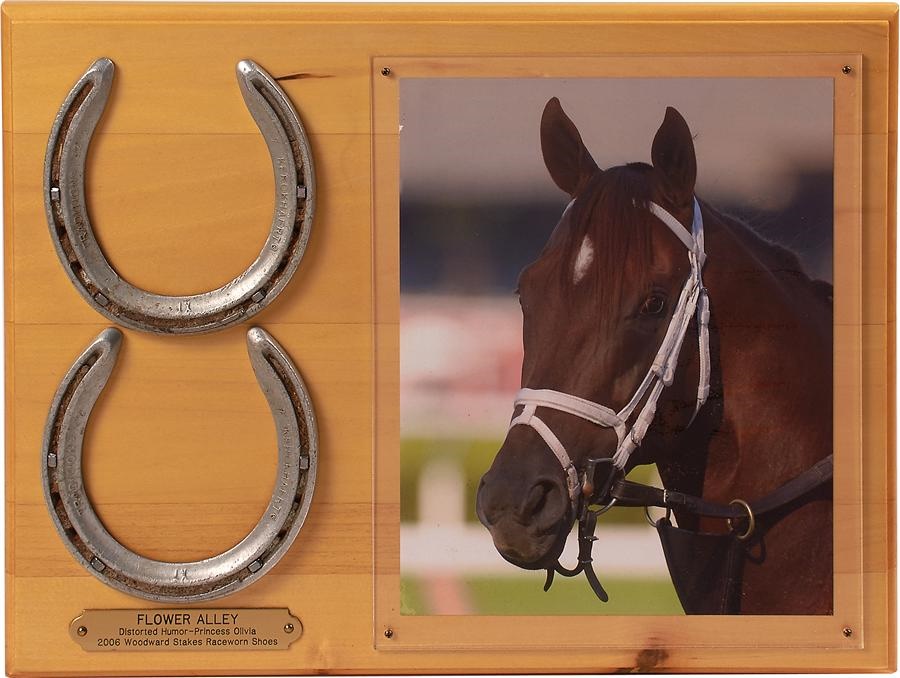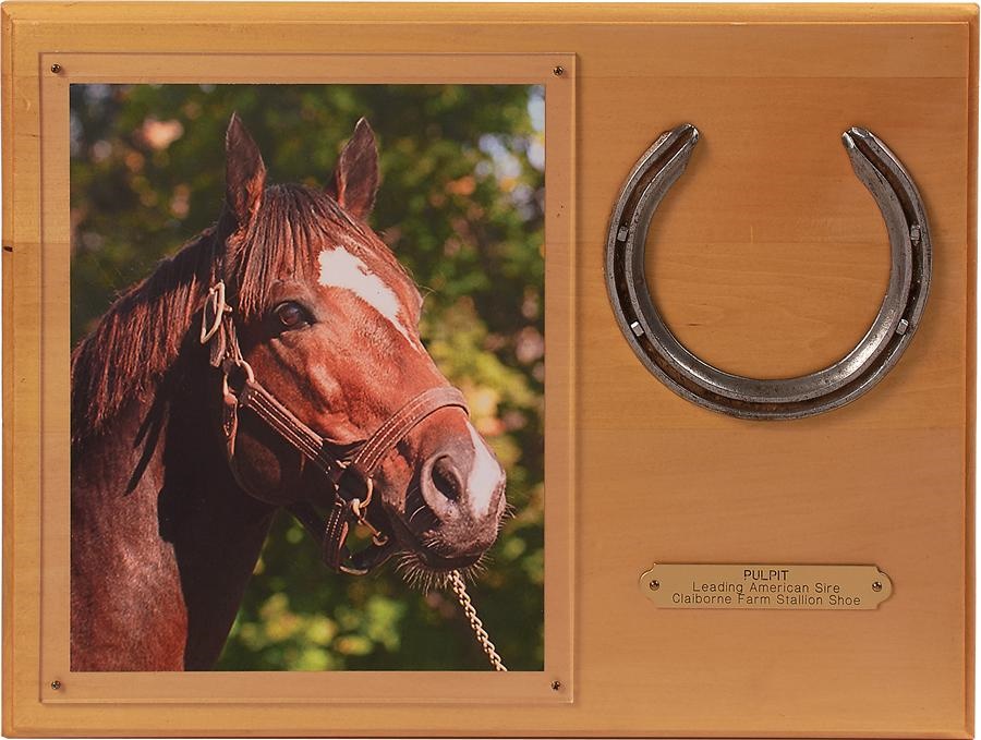 This lot consists of shoes worn by two of the most popular sires in North America: Pulpit and Flower Alley. Pulpit's foals earned more than $60 million on the track and among his progeny is the #1 sire of 2014 in North America, Tapit. Flower Alley is the sire of 2012 Kentucky Derby and Preakness champ, I'll Have Another. This lot consists of a stallion shoe worn by Pulpit in retirement, mounted on a wood plaque with a photo and two winning shoes from Flower Alley's win in the Woodward Stakes. Both come with COAs.
