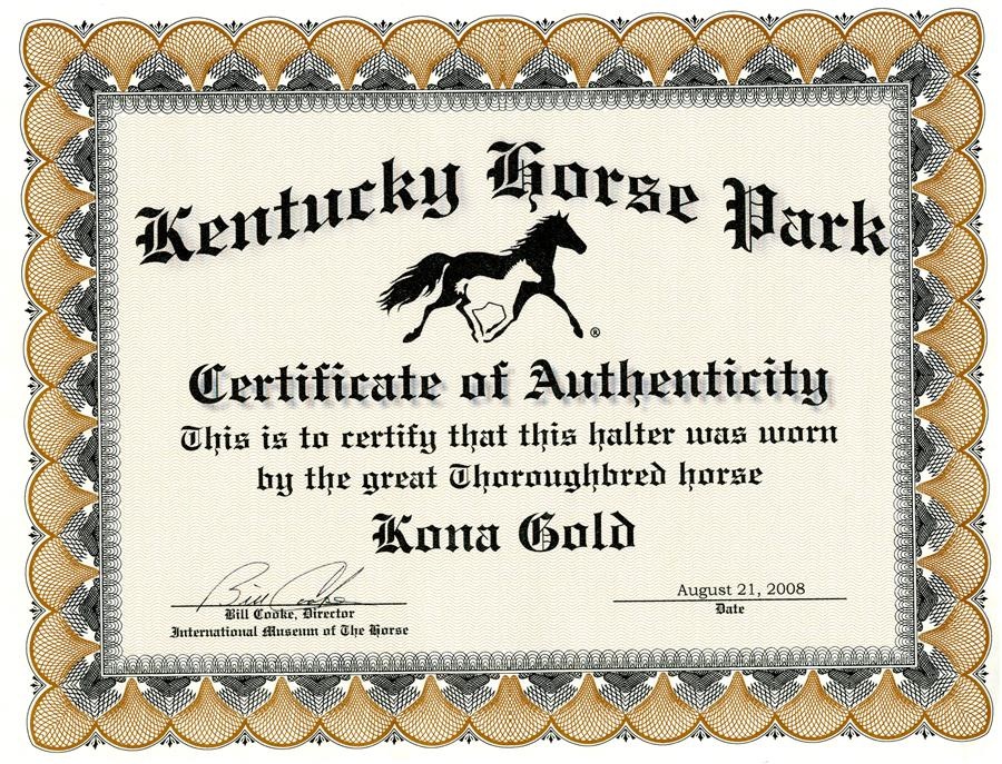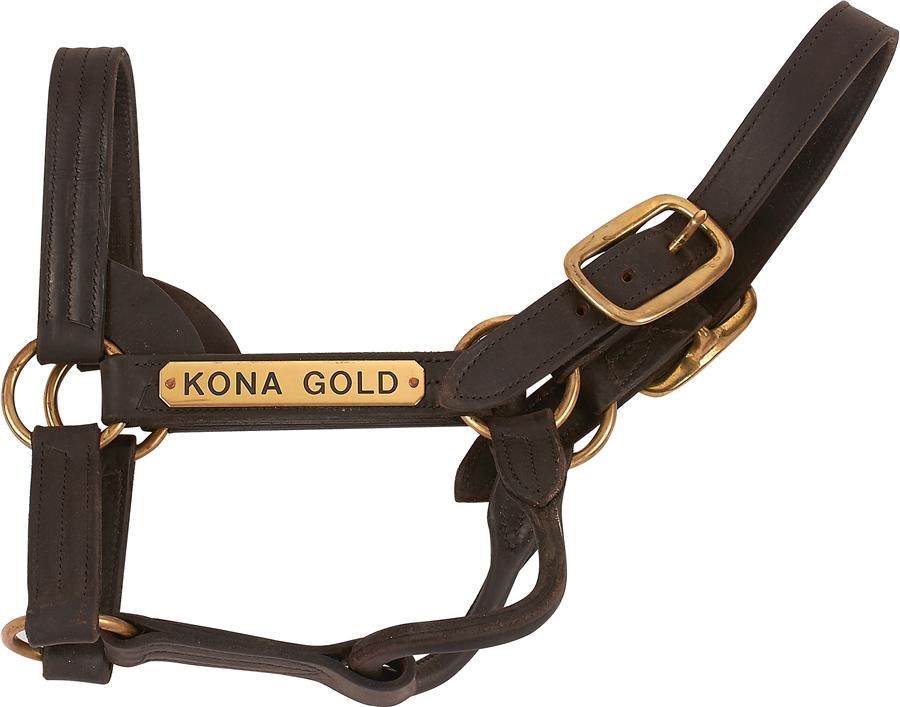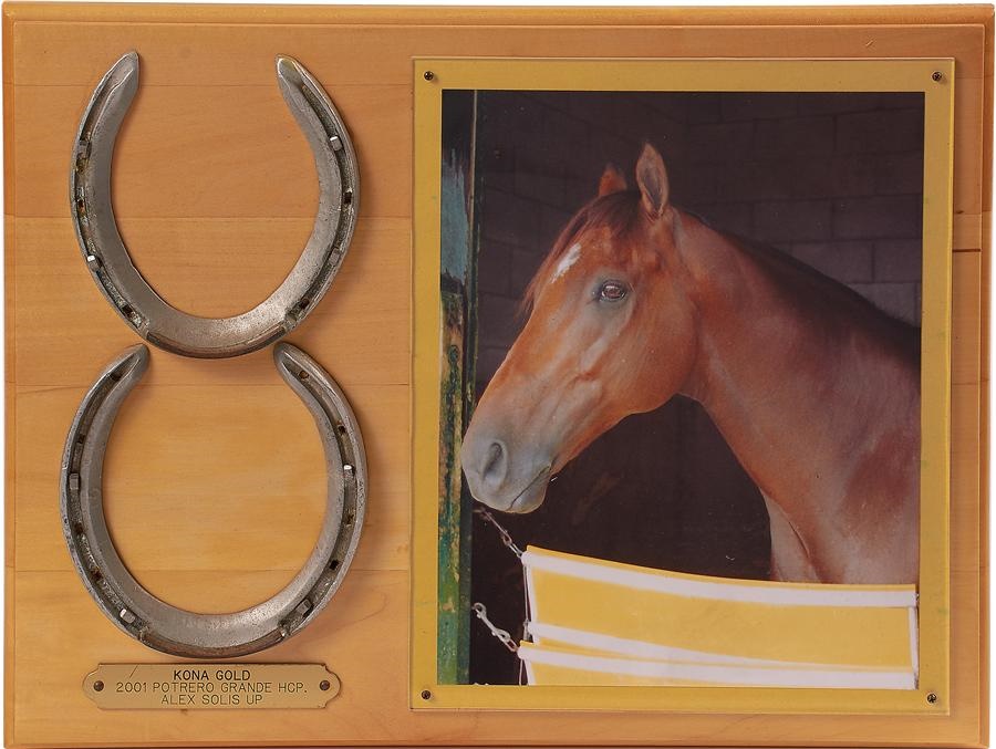 Arguably one of the best sprint horses in North American racing history, Kona Gold won over $2.2 million in his career and took home the Eclipse Award for Outstanding Sprinter in 2000 - the same year he won the Breeders Cup Sprint. All told, Kona won 11 sprint races, including the Potrera Grande. These shoes are from his win in that race and come mounted with a photo on the wood plaque. COA included.