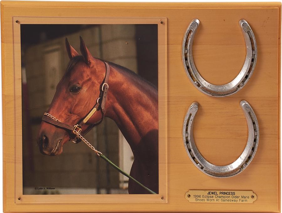 Jewel Princess was the winner of the 1996 Breeders Cup Distaff on her way to winning the Eclipse Award that year for Outstanding Older Female Horse. For her career, Jewel Princess won 10 stakes races and nearly $2 million on the track. These two shoes were worn by Jewel Princess in retirement and come mounted on a plaque with a photo. COA also included.