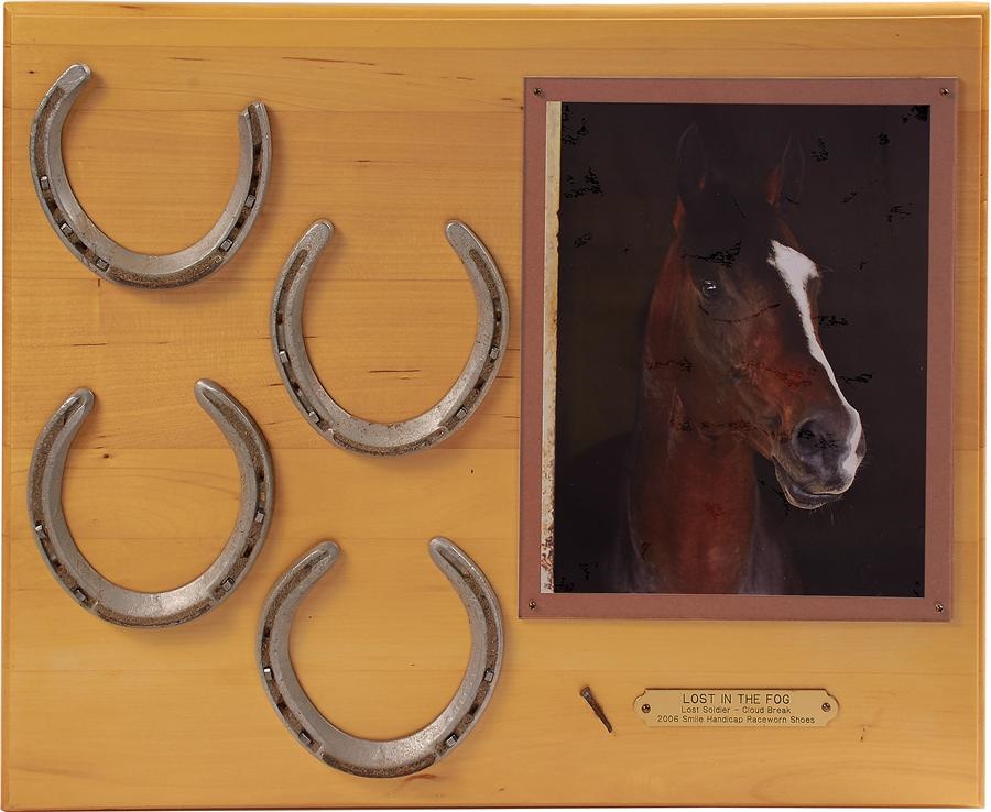 Lost in the Fog, the 2005 Eclipse Award-winning sprinter and arguably most popular horse to come out of Northern California since Seabiscuit, began his magnificent career with 10 straight victories before suffering his first loss in the Breeders' Cup Sprint. As a 4-year-old in 2006, Lost in the Fog won once, taking the Aristides Breeders' Cup Handicap (gr. III) at Churchill Downs in June. It was later learned that the "Fog" had been racing with three cancerous tumors in his spleen and along his back. For his career, he captured 11 of 14 starts and earned $978,099. Offered here are all four of his shoes from his winning Smile Handicap, mounted on a wood plaque, with COA.