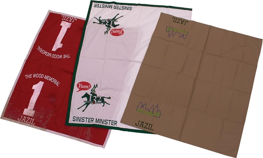 Lot # 62: Jazil Wood Memorial Cloth and Belmont Stakes Exercise Cloth and Sinister Minister Kentucky Derby Exercise Cloth