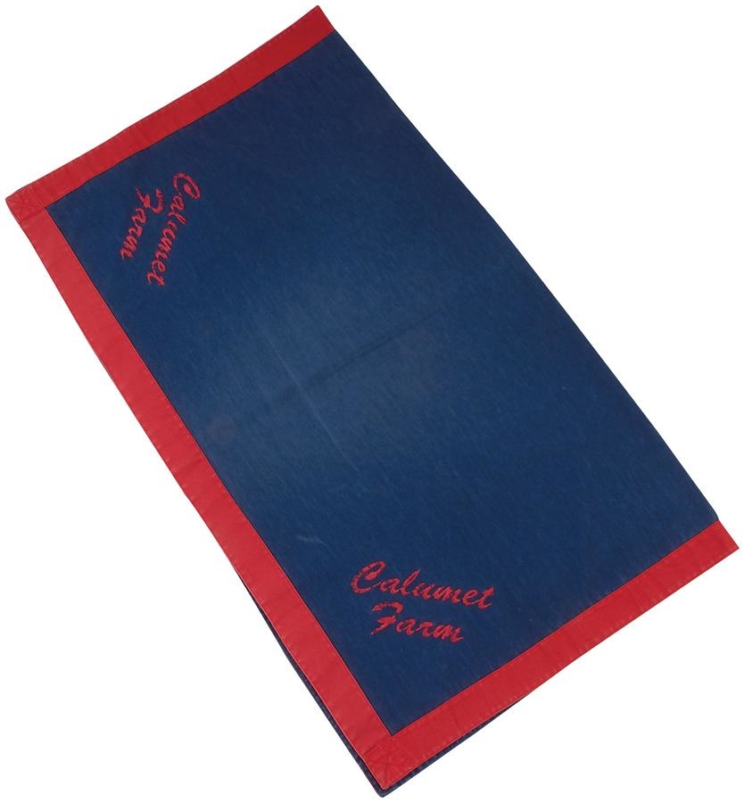 Calumet Farm has a record history of Kentucky Derby and Triple Crown winners and throughout its history of over 87 years, it has produced some of the greatest Thoroughbred horses of all time, including two triple crown winners (Citation and Whirlaway), eight Kentucky Derby winners, seven Preakness Stakes winners and 11 Hall of Famers. Offered here is a training cloth worn by an unknown racehorse at Calumet Farm.