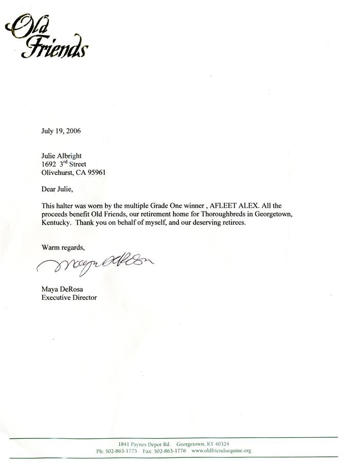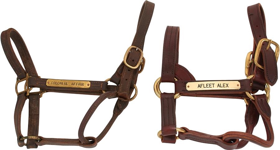 Offered here are halters from two winners of the third jewel of the Triple Crown, the Belmont Stakes. A stallion halter worn by 1995 champion (and Preakness winner) Afleet Alex and a rare track halter worn by 1993 winner Colonial Affair. Both halters come with COAs.