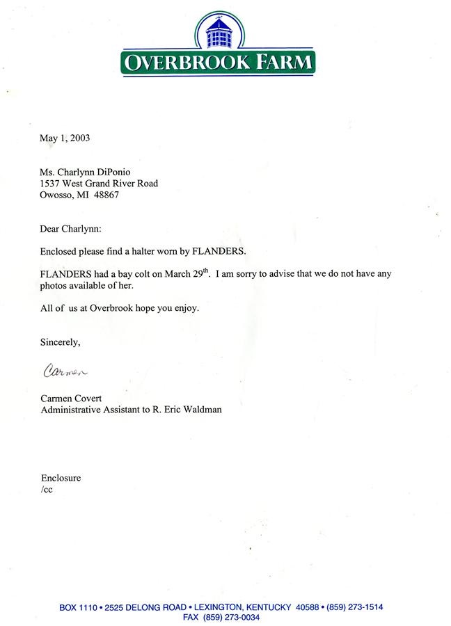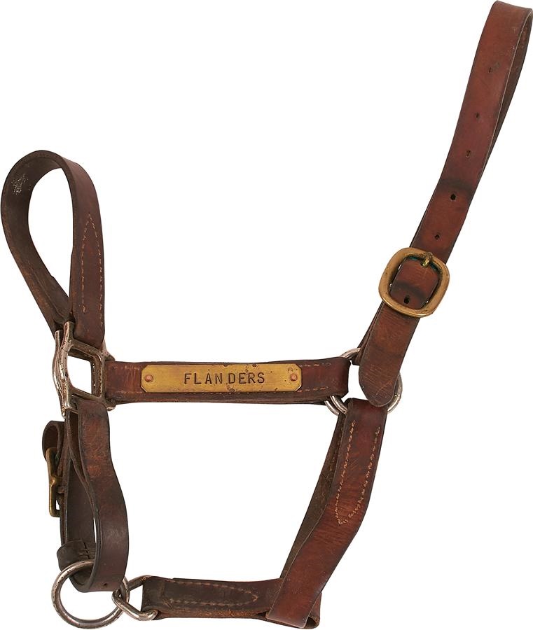 Flanders won all five of her career races, although she was disqualified from the Matron Stakes and placed last due to testing positive for the prohibited therapeutic drug isoxuprine. She then went on to win her next race, the Frizette Stakes, by 21 lengths. She is best known for winning the Breeders Cup Juvenile Fillies. Unfortunately, she came out of that race with a condylar fracture of the cannon bone and a fractured sesamoid. She underwent surgery and was retired in early 1995. This broodmare halter was worn by Flanders and comes with COA.