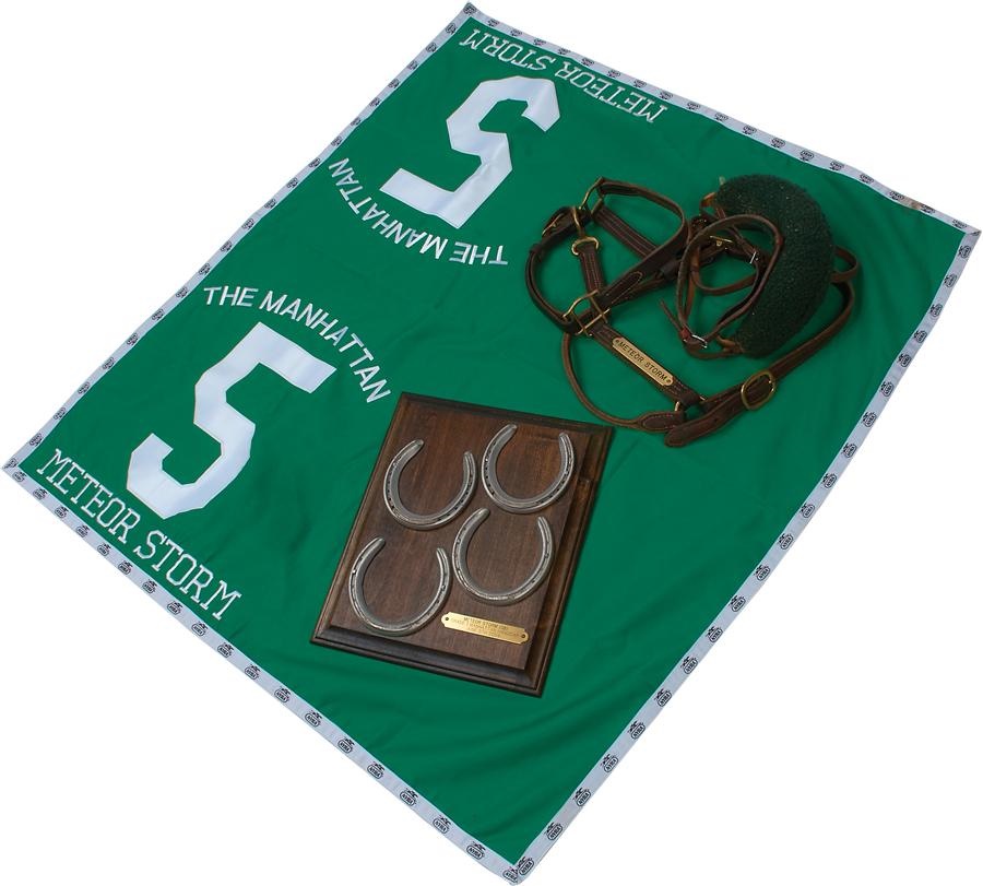 Lot # 141: Meteor Storm Halter, Shadow Roll, Shoes and Cloth From Manhattan Win
