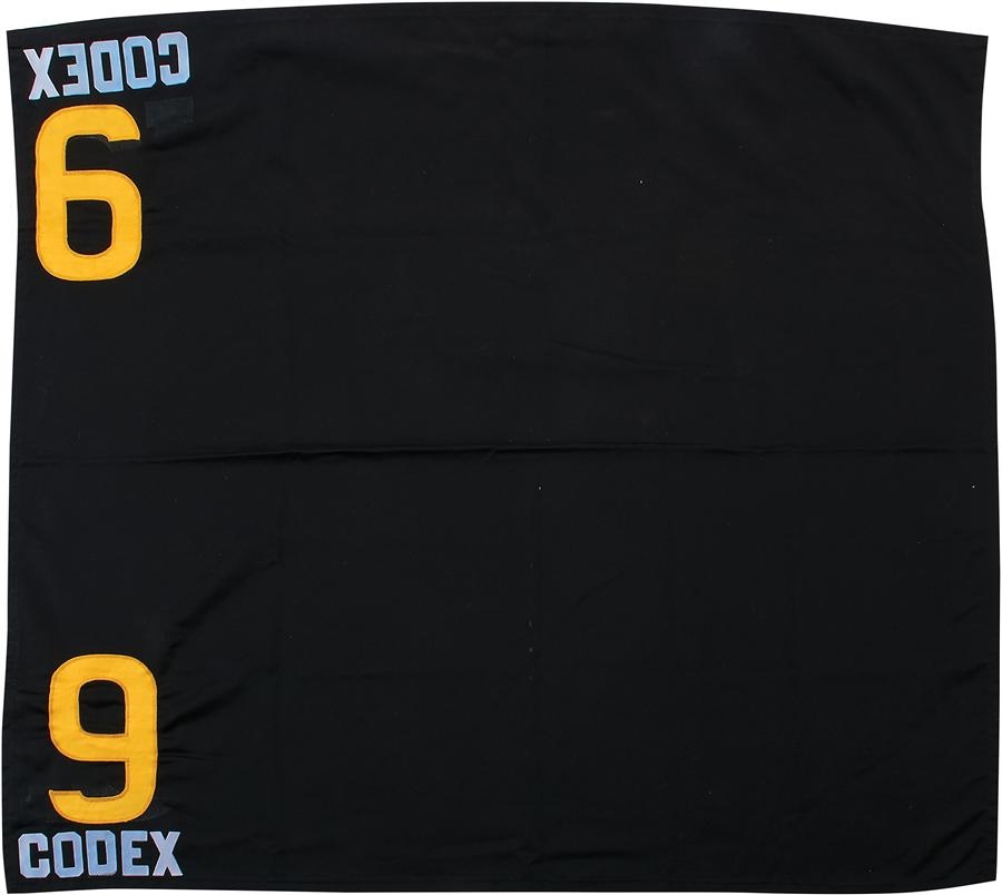 Winner of the 1980 Preakness Stakes, offered here is the saddle cloth Codex Santa wore in his victorious Santa Anita Derby that same year. This triumph began a string of three grade I victories in a row for Codex which culminated in the infamous Preakness Stakes win over the Derby winning filly Genuine Risk during a controversially rough trip while being ridden by Angel Cordero. He was trained by Wayne Lukas (for which that was his first Triple Crown win) and bred and owned by Tartan Farms in Florida. He was by Arts and Letters out of Roundup Rose by Minnesota Mac, later finished off the board in the Belmont Stakes, and was subsequently retired with a record of 15/6/2/1 and earnings of $535K.