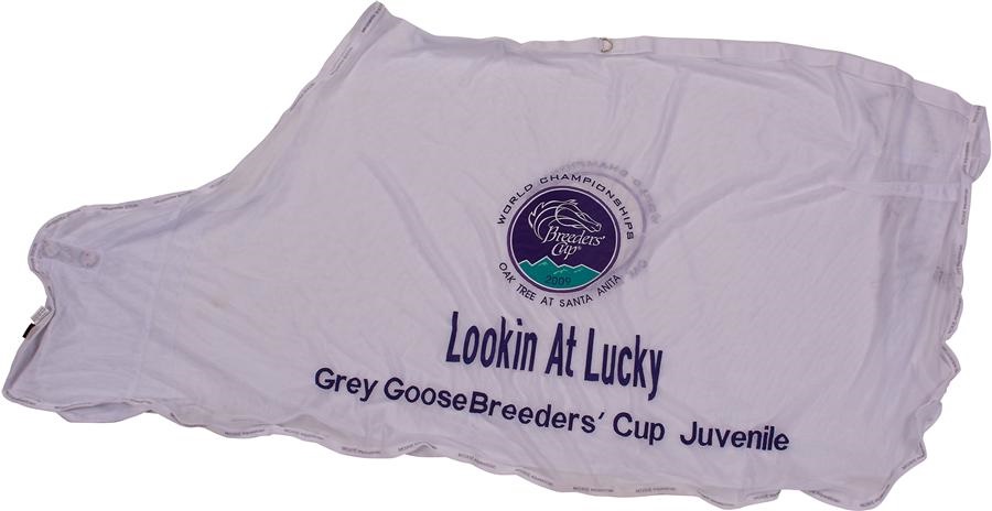 In 2010, Lookin at Lucky became the first horse since the great Spectacular Bid to be named both two-year old and three-year old Eclipse Champion. Along the line, he won multiple stakes races including the 2010 Preakness Stakes. Overall, he won nine of 13 career starts for $3,307,278. This fly sheet blanket was worn by Lookin at Lucky during the week of the Breeders' Cup leading up to his runner-up finish in the Juvenile.