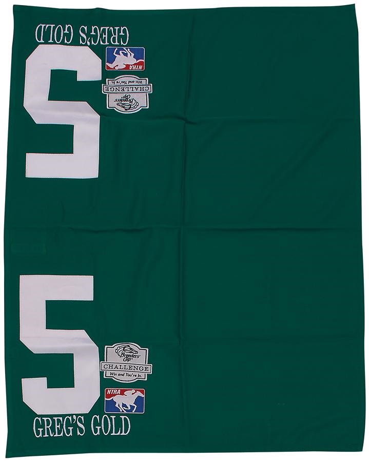 This is Greg's Gold Winning Saddle Cloth Grade 2 from the 2007 Pat O'Brien Breeders' Cup from Del Mar. Winner of over $1 million in his career, this cloth was worn by Greg's Gold during his score in the 2007 Pat O'Brien Breeders Cup Stakes at Del Mar Race Track.