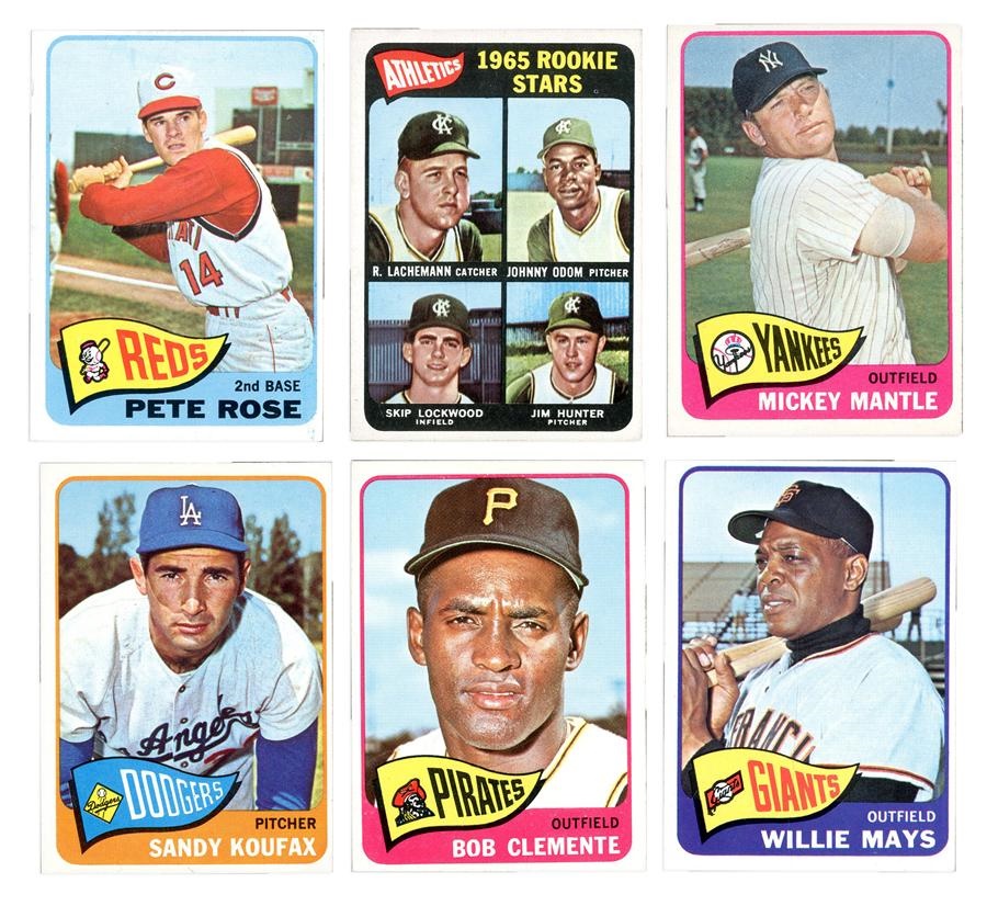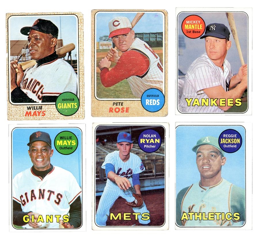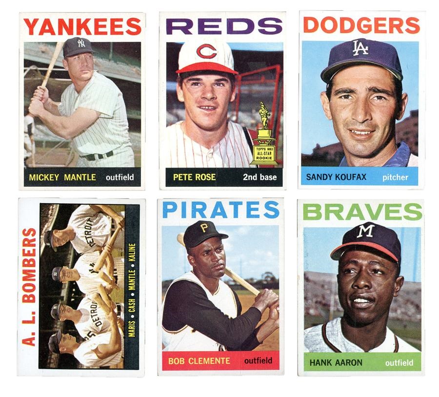 All kinds of great stuff here. Includes: 1) 1960 (328) with Hodges, Ashburn, Stuart, Kaat, Tigers and Dodgers. 2) 1961 (379) with Drysdale, Gibson, Cepeda, Ashburn and B. Robinson. 3) 1962 (328) with Hodges, Mathews, Martin, Roberts, Cepeda, Yankees, Marichal, Mazeroski, Musial 21st Season and Perry. 4) 1963 (281) with 1962 National League Strikeout Leaders, Hodges, E. Howard and F. Robinson. 5) 1964 Near Set (574/587) with Rose, Mantle, Clemente, Aaron, Koufax and Maris/Cash/Mantle/Kaline A.L Bombers. 6) 1965 Near Set (581/598) with Mantle, Mays, Koufax, Rose, Clemente and Lachemann/Odom/Lockwood/Hunter Rookie Stars 7) 1968 (498) with Mays, Rose, Yastrzemski, B. Robinson, 1967 AL RBI Leaders, 1967 NL Home Run Leaders, 1967 AL Batting Leaders, Killebrew All Star, Palmer, Joe Morgan All Star, Jenkins, Aaron All Star, 1967 NL RBI Leaders, Mayo Smith, Kaline, Mathews, Killebrew, Lou Brock WS Game #1 and Carl Yastrzemski All Star. 8) 1969 (658) with Mantle, Ryan, Bench, Mays, Floyd/Burchart,Fingers 1969 Rookie Stars, R. Jackson, Clemente, Aaron, Rose, Killebrew, Yastrzemski, Kaline, Frank Robinson, McCovey, Carlton, Palmer, Brock and Jenkins.