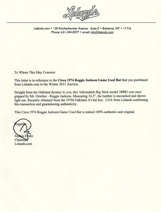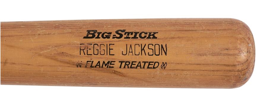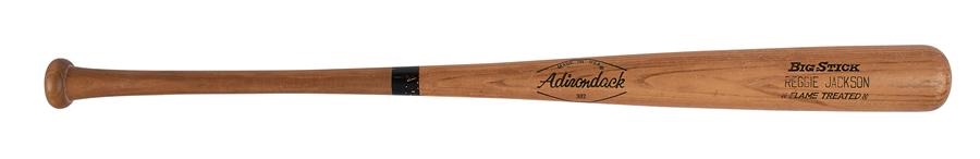 Straight from the Oakland dynasty to you, this Adirondack Big Stick model 288RJ was once gripped by Mr. October - Reggie Jackson. Measuring 34.5", the lumber is uncracked and shows light use. Recently obtained from the 1970s Oakland A's bat boy. LOA from Leland's confirming this transaction and guaranteeing authenticity.