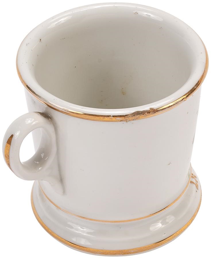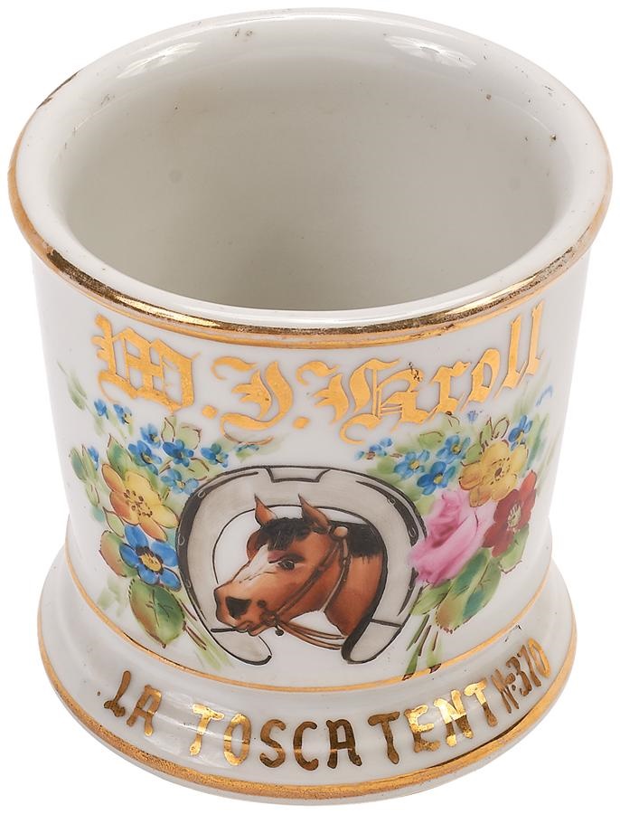 From a bygone era comes this elegant occupational shaving mug circa 1890s, which reads in gold gilt "W.J. Kroll, La Tosca Tent N-370." In the center is a hand painted image of a horse head surrounded ornately by a floral design. This mug is historically significant, La Tosca was a race mare owned by August Belmont, during the early days of American horseracing and in New York and its environs. As a race mare she won the 1891 Swift Stakes, and was forever called "my beautiful La Tosca" by then-owner August Belmont. The gold gilt is a bit worn on the rim, otherwise NRMT. Measures 3.75" high.