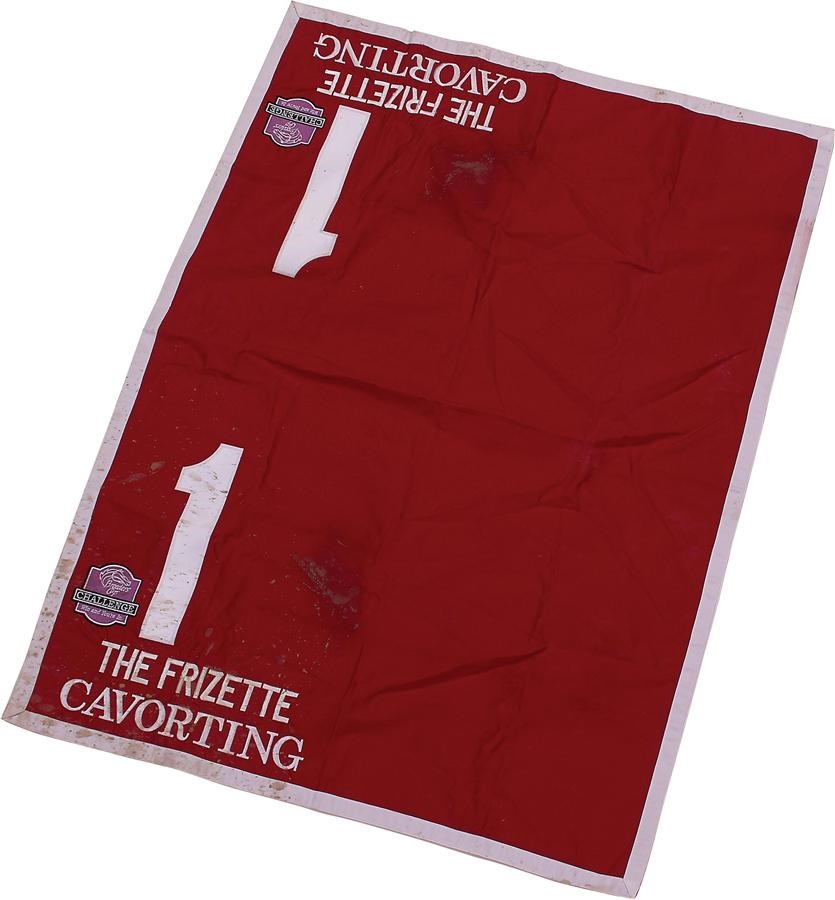 Offered here is a saddle cloth with white lettering on quality summer red cotton, worn by champion Breeders' Cup sprinter Cavorting in her off-the-board finish in the 2014 Grade 1 Frizette, the filly equivalent of the Champagne Stakes. The saddle cloth is in perfect race worn condition, with dirt from Belmont's legendary racing surface. This precocious filly is bound to be a superstar, thus this could be an excellent investment. Measures 34x92" with some splatters of dirt, otherwise NRMT condition.