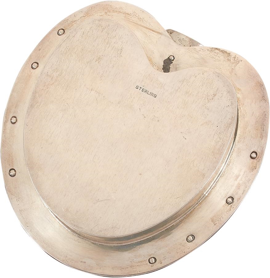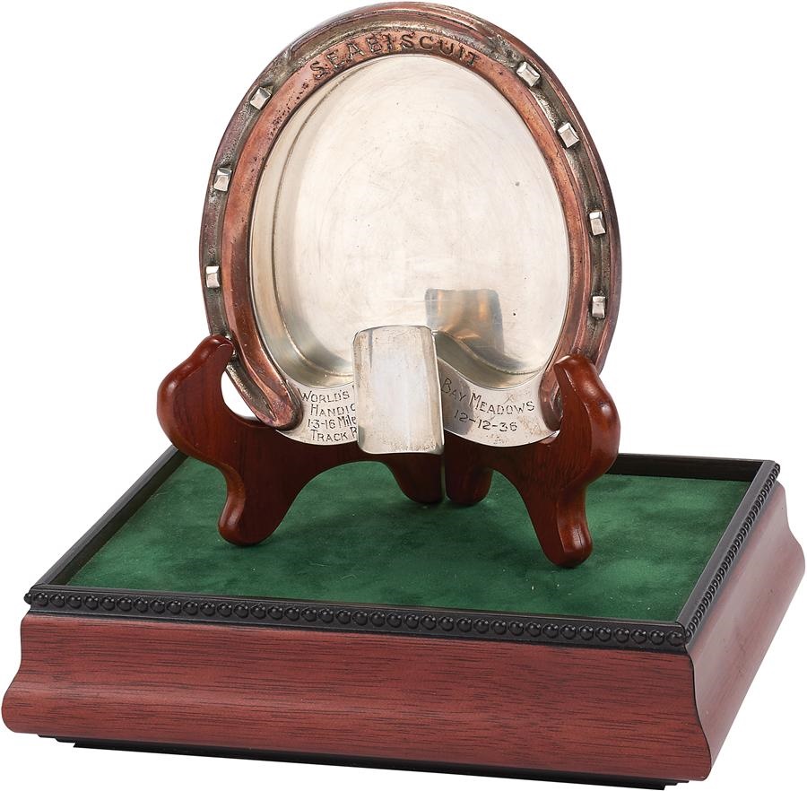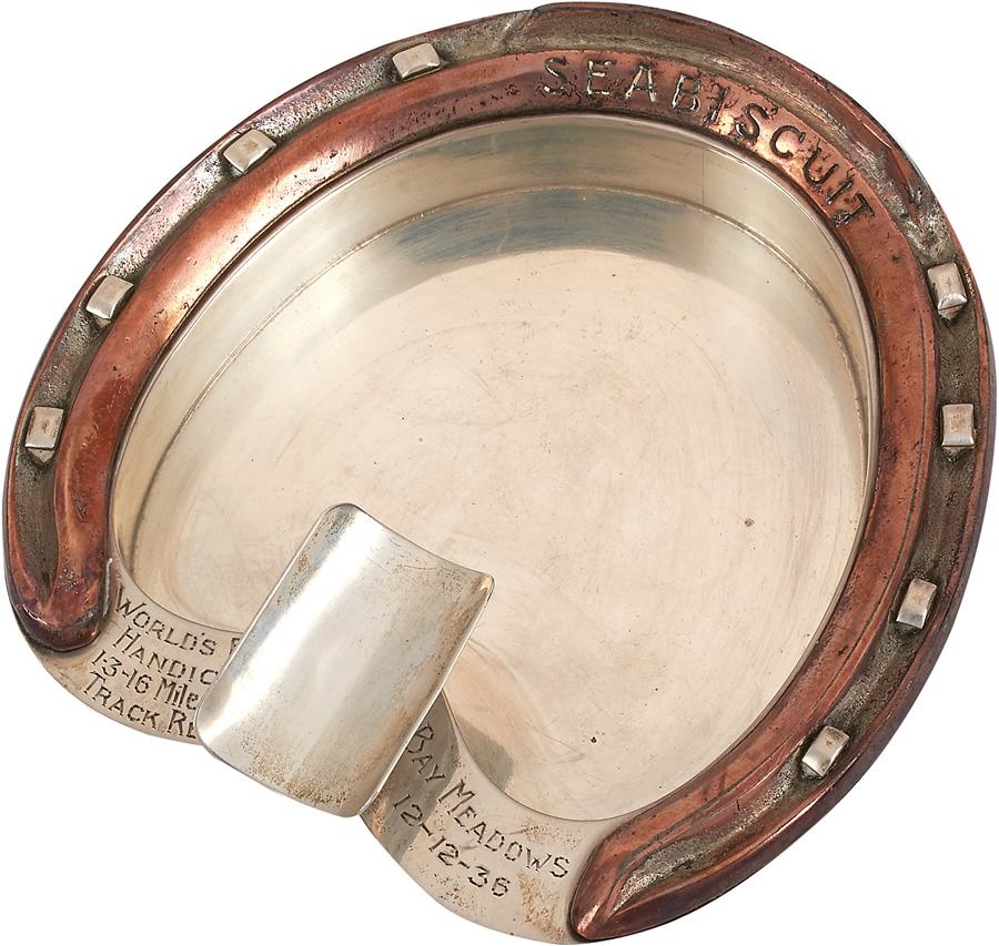 Charles Howard not only knew cars, horses and more, he also knew how to give one heckuva gift. An example is this resplendent sterling silver ashtray with horseshoe of the immortal Seabiscuit encased within. Lovingly engraved "Seabiscuit, World's Fair Handicap 1-3-16 Miles - 1.55 4/5, Track Record, Bay Meadows, 12-12-36." Engraved "Sterling" on the back. This exact shoe is referenced and pictured in Laura Hillenbrand's memorable book, on pages 126 and 127. Includes display case.