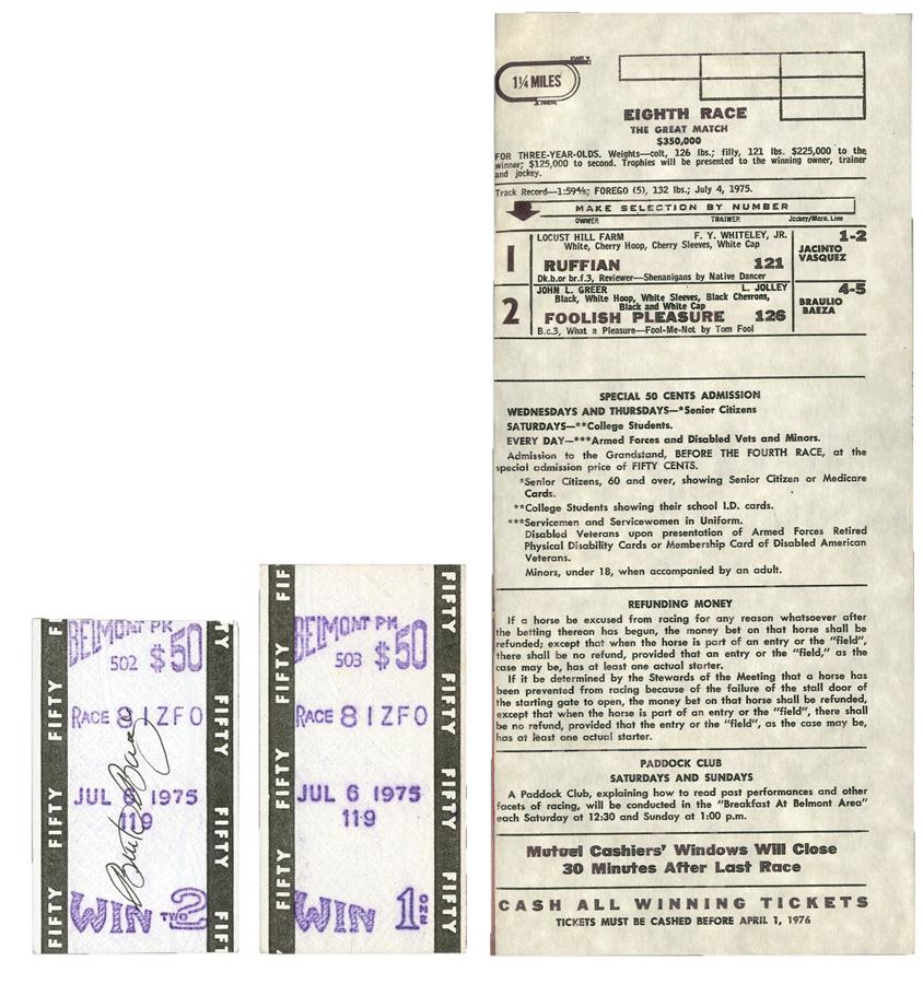 Lot # 159: Mint $50 Win Ticket on Ruffian & Mint Complete $50 Win Ticket on Foolish Pleasure from the 1975 Match Race