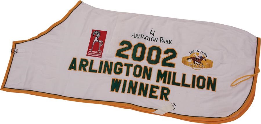 From the last of Beat Hollow's three major race wins in 2002, the thoroughbred was draped in this winner's blanket at the Arlington Million Stakes in Arlington, Illinois. The fluffy white fleece with green and gold lettering/trim is in perfect condition and features many design symbols embroidered in.