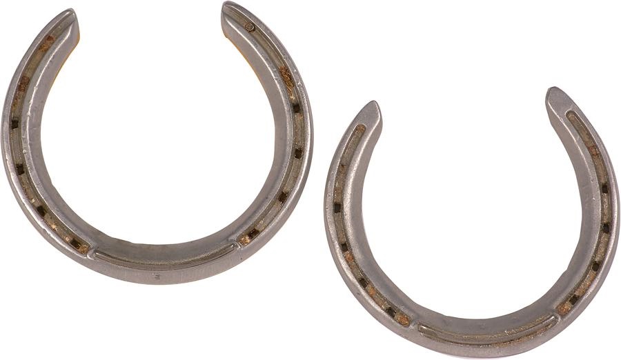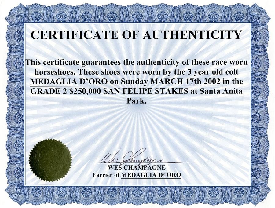 Get lucky with this pair of horseshoes that were worn by Medaglia D'Oro as a three year old during his win at the March 17, 2002, (Grade 2 $250,000) San Felipe Stakes at Santa Anita Park. Comes with a provenance - a signed certificate from Wes Champagne, his farrier at the time. Shortly after the San Felipe, Medaglia D'Oro came in fourth during the Kentucky Derby. He went on to win the Grade II Jim Dandy Stakes and the Grade I Travers Stakes at Saratoga Race Course that year.