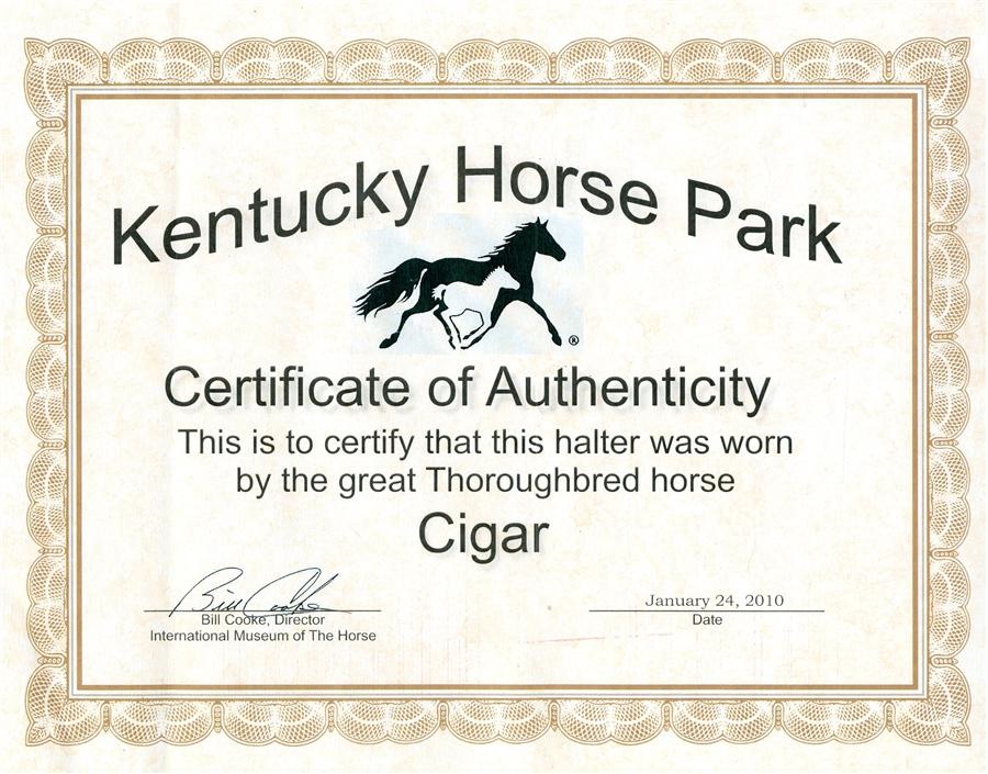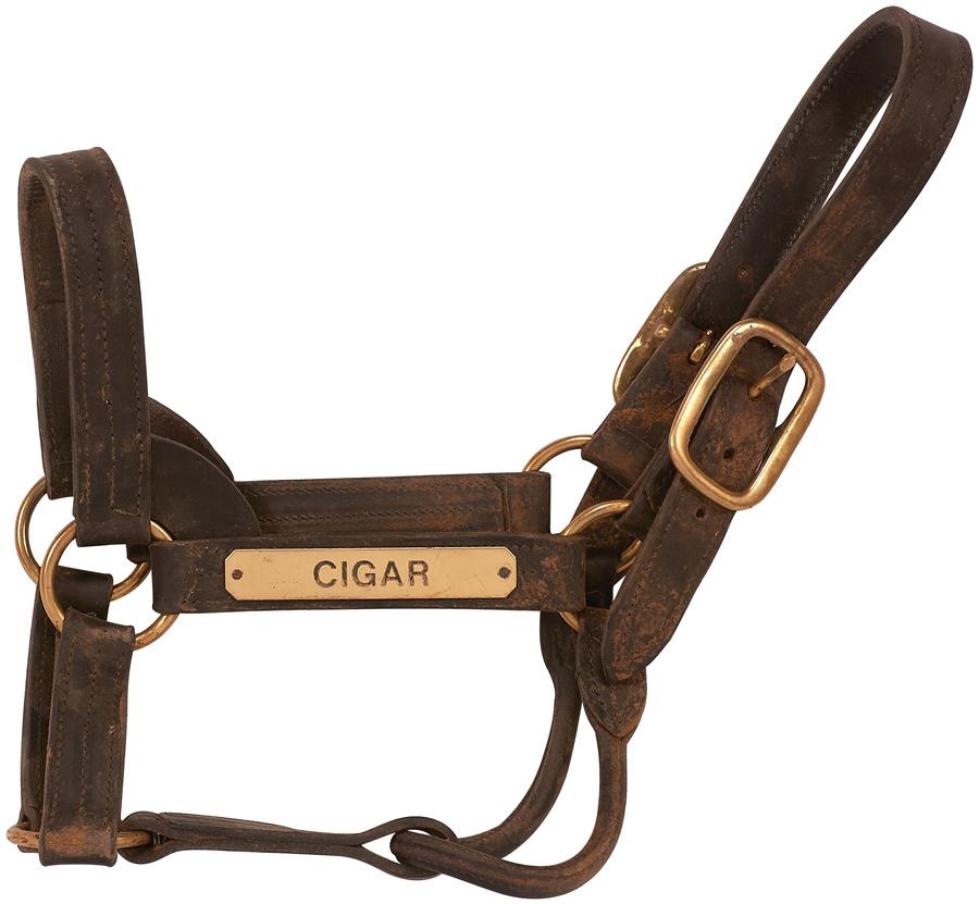 Undisputed horse of the decade, Cigar conquered the thoroughbred racing world by reeling off 16 consecutive victories spanning from 1994-1996 and in the process defeated racing’s absolute elite thoroughbreds from Southern California to the deserts of the United Arab Emirates. Upon his retirement in 1996, his earnings were just shy of $10,000,000, making him the richest American thoroughbred of all-time. He was the most anticipated stallion prospect in years but it was soon determined that “America’s Horse” was infertile and his owners cashed in an insurance policy of $25,000,000 – a record. Cigar soon called the world famous Kentucky Horse Park home where he welcomed visitors from around the globe up until his passing in 2014. It was during his residence at the KHP that Cigar wore this heavily used leather halter featuring a brass nameplate. COA from the Kentucky Horse Park is included.