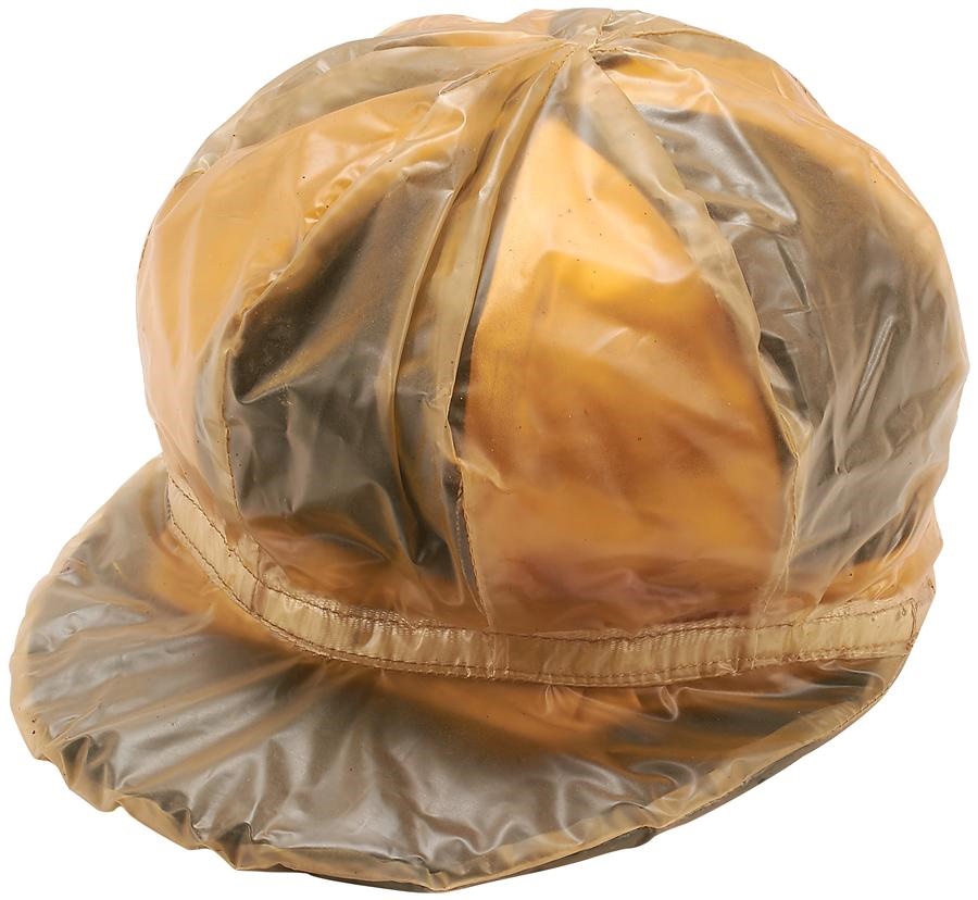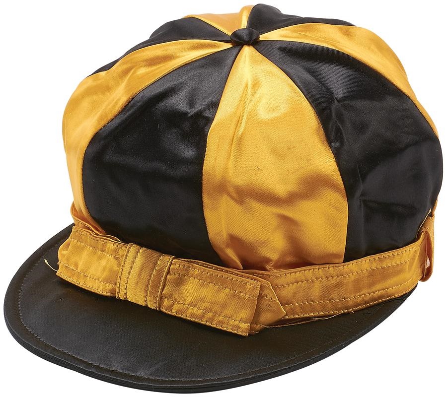 Formidable colors highlight this black and yellow satin riding cap with a plastic protector to protect the expensively made cap when it rains. Inside is lined with heavy acrylic fabric and a leather band to keep the form around the head. This was made for a small man, condition is EX-MT.