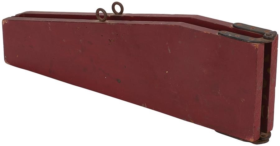 An incredible piece, this was used in a store to advertise the goods from this early Canton, Ohio, maker of "Horse Boots & Horse Racing Specialities." This is the earliest such piece we have ever seen. Handpainted early stenciling make this a fabulous piece of horse racing, folk art, primitive and advertising display. Interestingly, the wood folds in half for easy transport for a salesman taking this in his carriage or horse and cart from town to town. Eye holes to hang, it is 100% original and in amazing, like-new condition. Spans 38" across and is a magnificent combination of old paint, wood, stenciling, iron and brass, a killer piece.