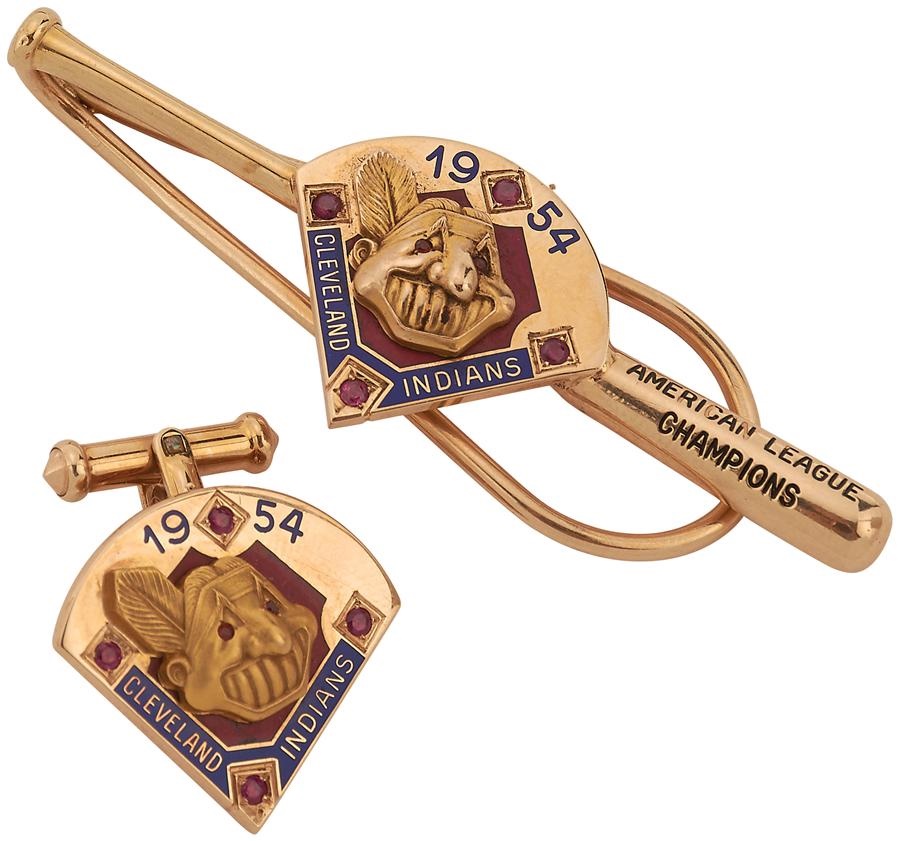 With the fourth highest wins total in a single season, the 1954 Cleveland Indians finished with a 111-43 record and an American League Championship. This cuff link and tie bar tandem were awarded to team members and some team employees, but one of the cuff links is missing. On the tie bar, there is a bat that reads "American League Champions" as well as a baseball diamond reading "1954 Cleveland Indians." On the back of the tie bar reads the engraving "1954 All Time Record, 111 Games Won." The back of the cuff link reads "American League Champions, 1954 All Time Record 111 Games Won" engraved on the back. On both items, there are four rubies on each diamond signifying the three bases and home plate as well as the stamping LGB (Balfour) and 14k.
