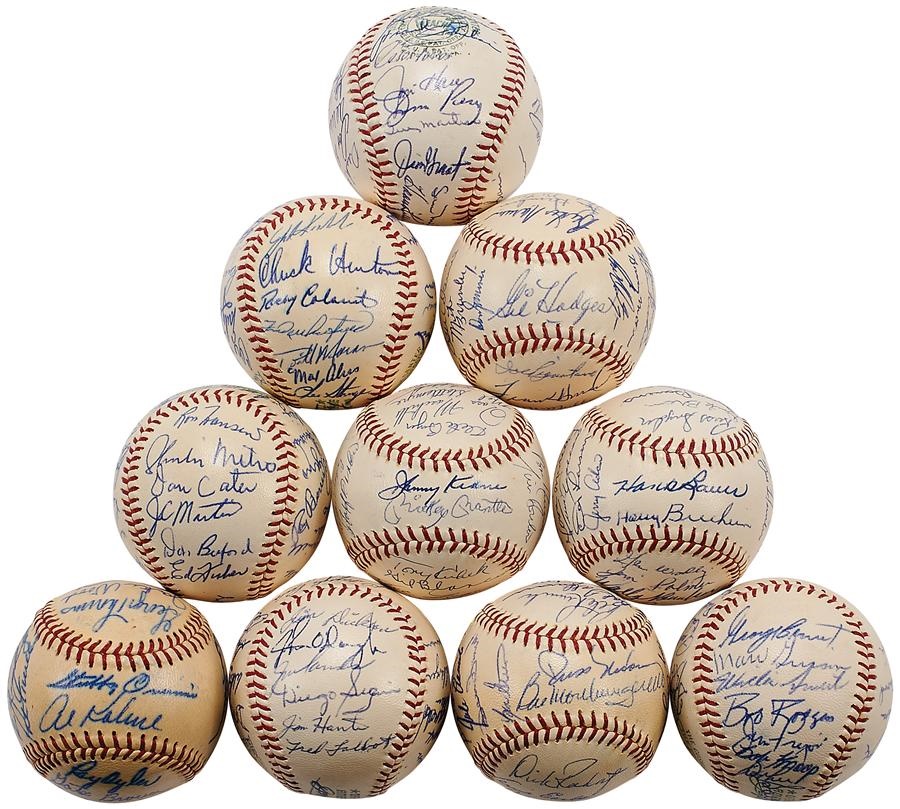 Presented to Bill Bloedel of Brown & Bigelow, who did the famed baseball prints and was the an important Minnesota Twins PR man,  these were presented at the 1965 All-Star Game in Minnesota with a letter from his daughter-in-law. All came from one baseball insider, and are on official American League baseballs. Here they are in the team's order of finish. 1) A.L. Champion Minnesota Twins. The nicest we have ever seen, a whopping 35 signatures with all the keys and more. Grades 8.5/10 by PSA/DNA. 2) Chicago White Sox, 30 signatures. 3) Baltimore Orioles, 31 signatures. 4) Detroit Tigers, 25 signatures EX-MT. 5) Cleveland Indians, 25 signatures. 6) New York Yankees,27 signatures, (Mantle secretarial). 7) California Angels, 25 signatures. 8) Washington Senators, 30 signatures. 9) Boston Red Sox, 30 signatures (no Yaz). 10) Kansas City Athletics, 27 signatures.  These baseballs and signatures are all NRMT better, if not NRMT-MT unless otherwise noted. These are not your typical "clubhouse" signed baseballs but we have seen very few clubhouse signatures: From the perfect 10 Gil Hodges on the sweet spot of the Senators ball to the picture perfect Tony Conigliaro on the Sox ball. The set comes in their original dozen count display box with 9/10 in their original ball boxes. You NEVER see a set such as this. Sadly, almost all "league" sets have been broken up. Here is a chance to keep something truly great together as one astounding package.