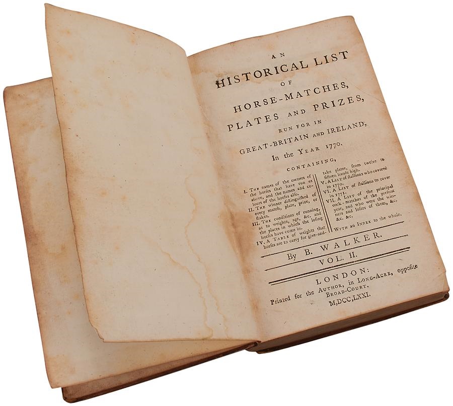 This classic leather-bound horse racing book was printed in London in 1771. Entitled "An Historical List of Horse-Matches Plates and Prices, Run For In Great Britain and Ireland In the Year 1770," it is by B. Walker and was "Printed for the Author, in Long-Acre." The condition is very nice overall and considering its age, still has tight binding, some very minor water damage to first pages, and interior contents are in superior condition. Available by subscription, which included all royalty; Dukes, Earls and Lords. 308pp. First Edition.