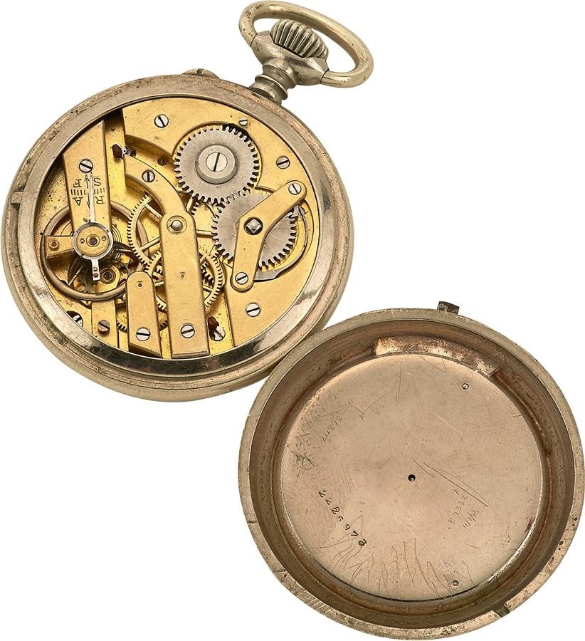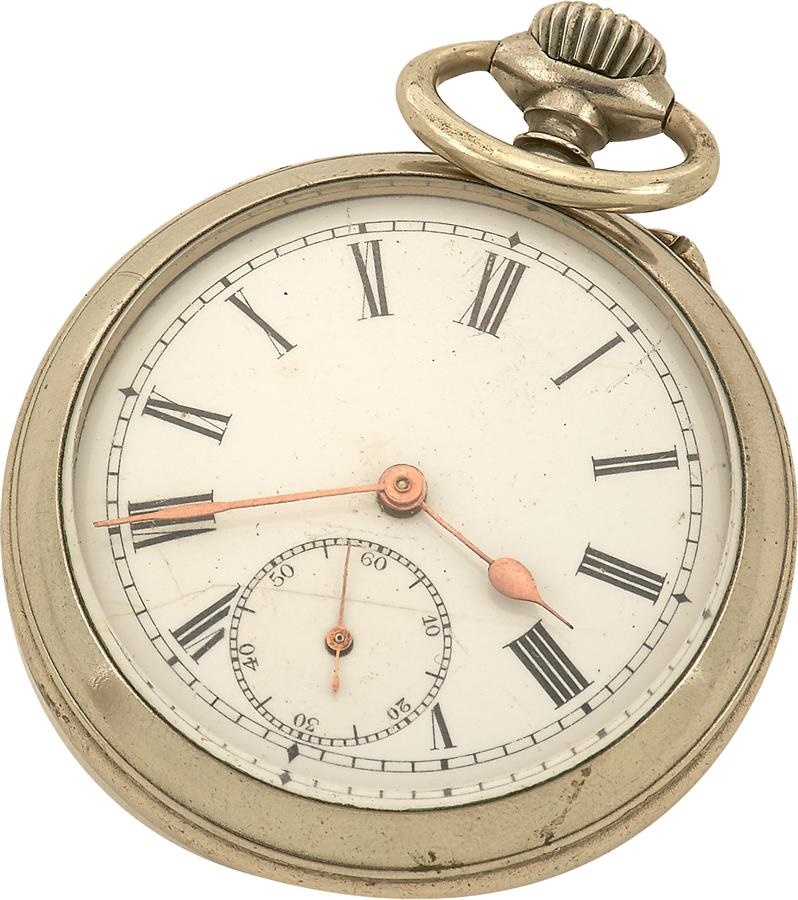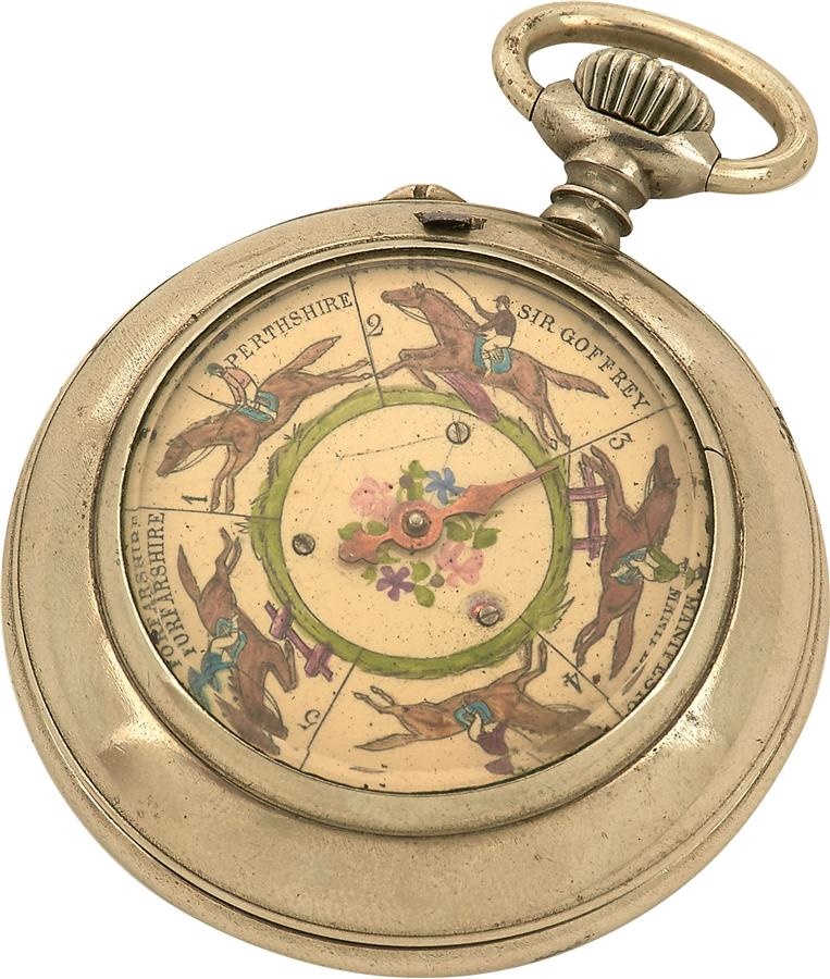 An unusual item, this nickel plated keyless-wind pocket watch comes with the rare feature of a horse race gambling game to the reverse, made for the European market. This is a beautifully made watch, made in circa 1910. It displays a white enamel dial with black Roman numerals and in bright condition. The diameter is 41 mm, and the crystal is also in excellent condition and retained securely.  Movement is a  cut three arm gold balance, with  hairspring and cylinder escapement and is overall of nice quality, with a cut-away plate. The watch is in non-working condition and requires repair to the cylinder lower balance pivot. Measures 41mm in diameter, and illustrated with actual horses of the day: Sir Geoffrey, Manifesto, Democracy, Turf Ashire and Pertshire.