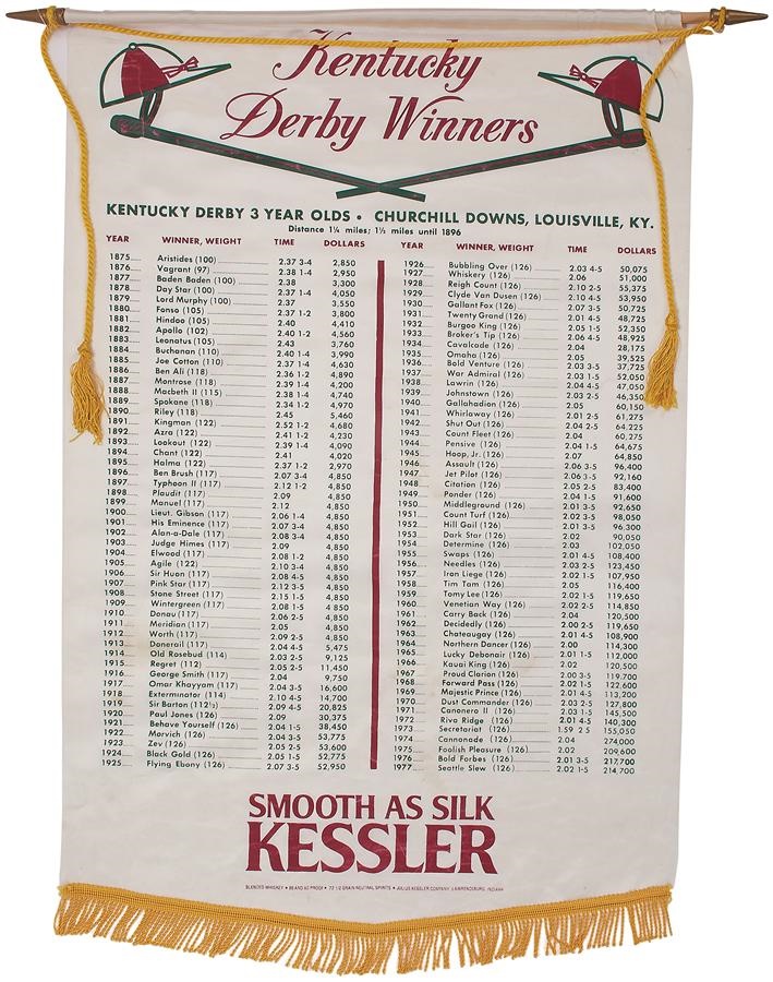 Offered here is a classic, large silk advertising banner for Kessler Whiskey. It lists all of the Kentucky Derby winners from 1875 through 1977 with the times and payouts. In 1875 it was $2850 verses $214,700 in 1977. Reads "Smooth as Silk Kessler" and measures 22x32", hangs from a stick, and rolls down to display, with fringe on the bottom. In EX-MT condition.