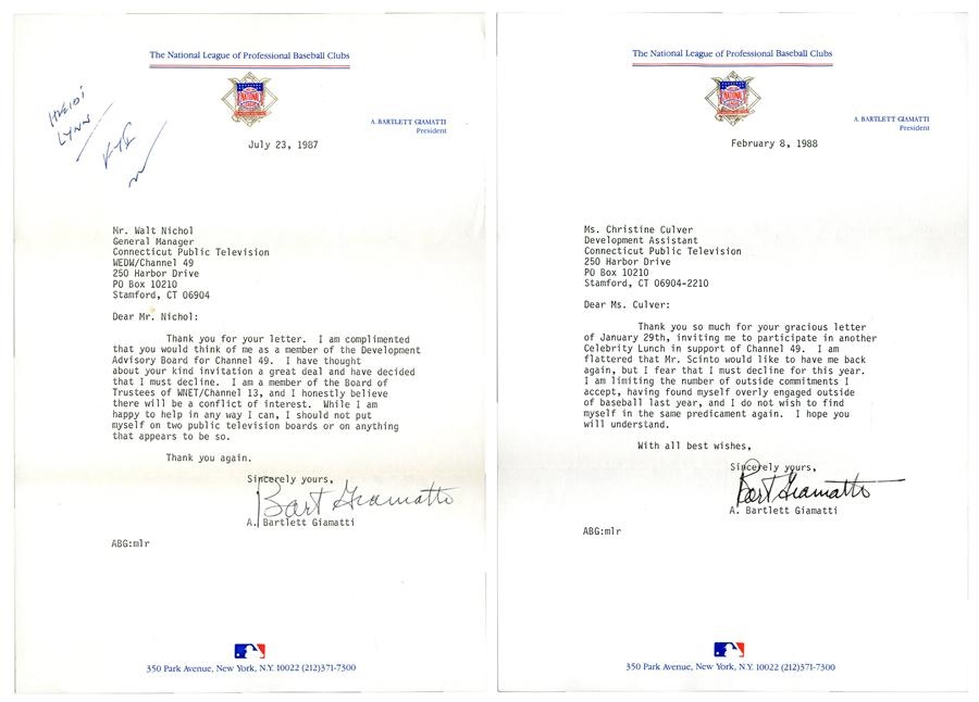 These typed letters were signed by Bart Giamatti in 8.5/10 pen while he was President of the National League in 1987 and 1988. One is from 1987, one is from 1988 and both are on his personal letterhead. Both have mailing folds and one has some writing in another hand. Content is in reference to appearing on Connecticut public television.