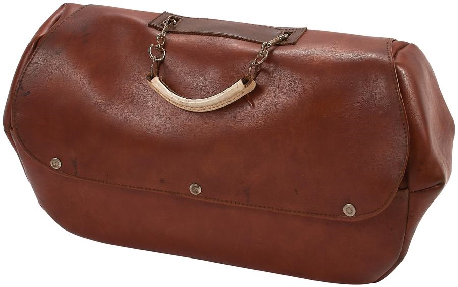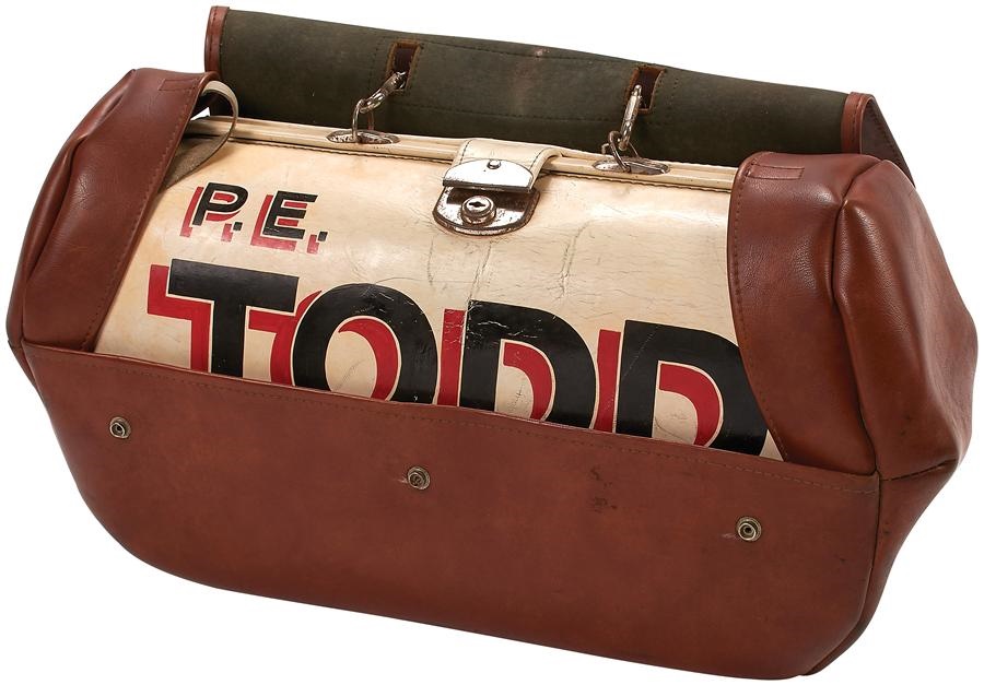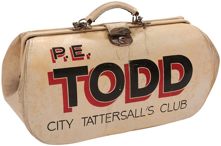 This is a sensational piece! Beautiful quality and design, it was designed for bookmakers specializing in horse racing, a double bag for carrying large amounts of cash at night through the rough and tumble parts of Sydney, Australia. You can just see the fog, and the dubious man following in shadow, so the second bag is to hide the purpose and name of vendor. A double bag for double protection, the internal bag is heavy duty white leather with three-dimensional writing that looks like something the flim-flam salesman would have carried from town to town. It has chrome snaps and reads P.E. Todd, City Tattersalls Club which was formed in 1895 by a group of twenty bookmakers disgruntled with a judge’s decision on a race; they left the established club and formed the City Tattersalls Club. The outer bag is a handsome soft leather bag, which is attached to the internal bag, overall measurement is 12x21" and the whole thing is in EX-MT condition.