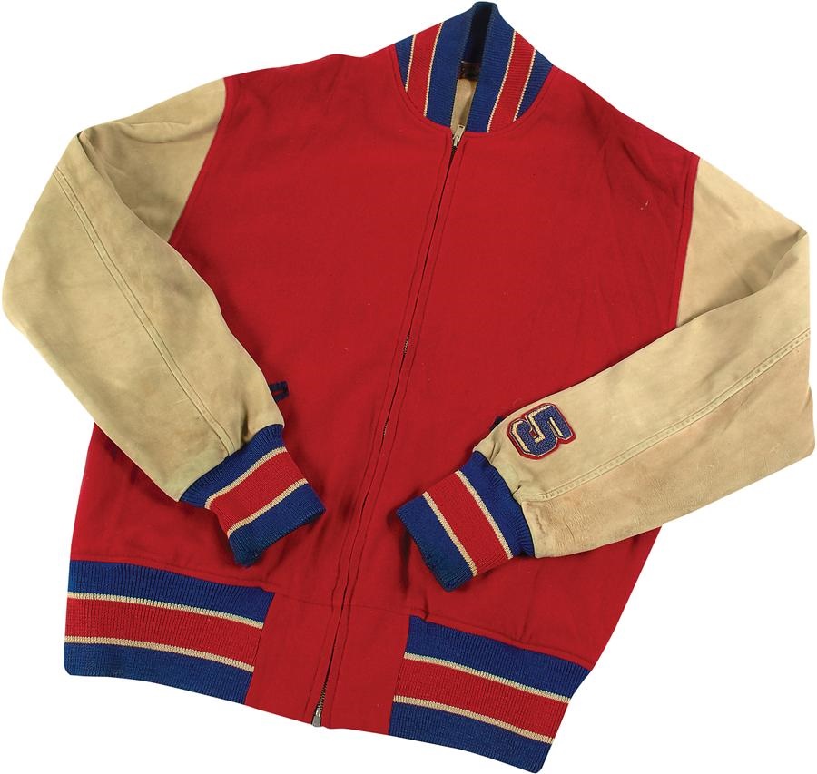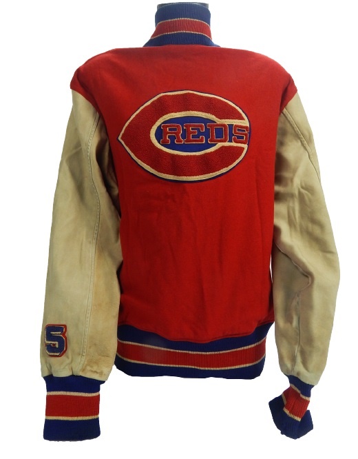 For being more than 70 years old, this 1940s Cincinnati Reds piece of history is a beautiful example of one of the nicest jackets ever made. Issued to the players near the mid-1900s comes this red body and blue trim heavy jacket with light tan buck skin sleeves. Embroidered with a "5" on the left sleeve, this was originally thought to be Willard Hershberger's jacket but the style and size (46) tagging indicates that it is from the early 1940s, after Hershberger was deceased. It was most likely used by Dick West, who wore number 5 on the Reds during the early to mid-1940s. Includes Jim Carrey tag in collar and King Sportwear Company tag inside the tail, the jacket is in superb condition and everything about it screams original including the chenille Reds logo on the back and working zipper.