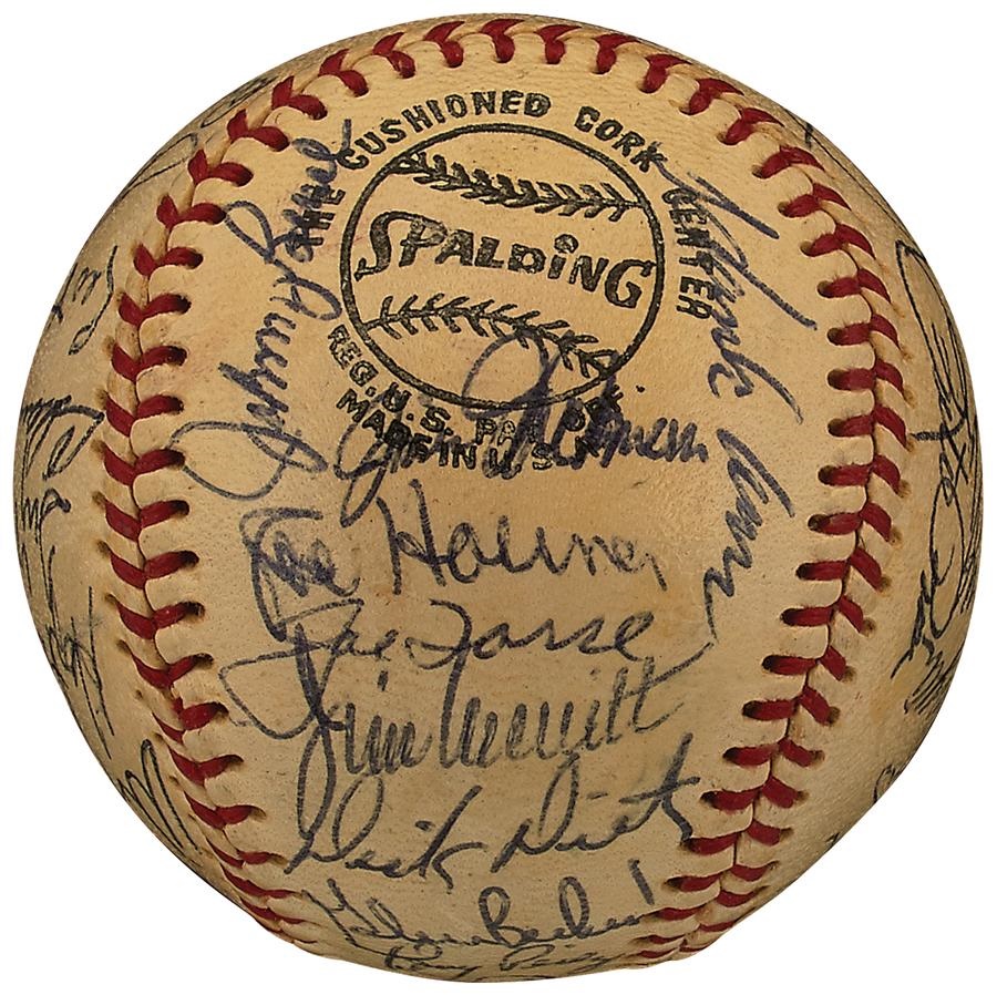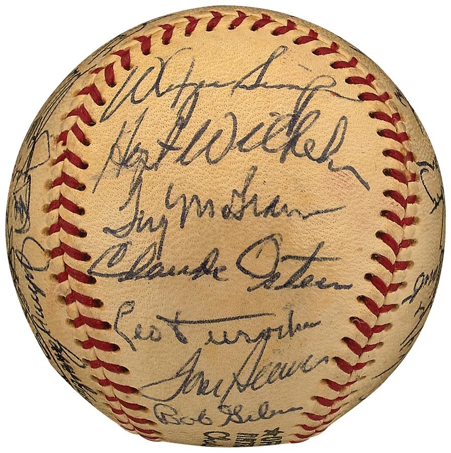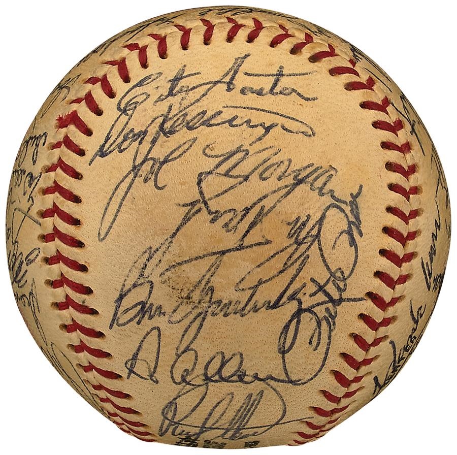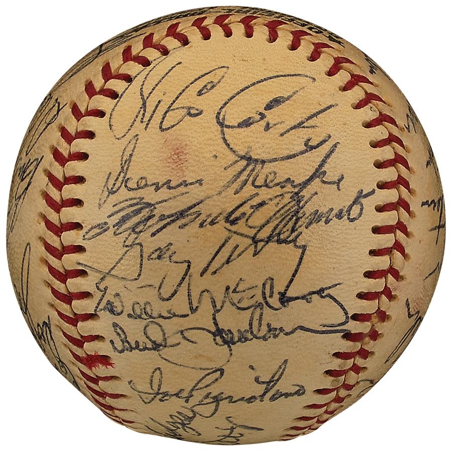 It is very rare to see an All-Star game go into extra innings, but the 12-inning 1970 midsummer match up was one that will go down in history. It's more than appropriate that the game, then played at the new home of the Cincinnati Reds, ended with Pete Rose running over catcher Ray Fosse for the game winning run. This high grade team signed Official National League Feeney baseball features 32 signatures of the 1970 NL All Stars including Roberto Clemente, Hodges, Mays, McCovey, Aaron, Seaver, Bench, Rose, Durocher, Torre, Perez, Morgan, Gibson, McGraw and more. The signatures average 8/10 and the ball is in Excellent to Mint condition (EX-MT).