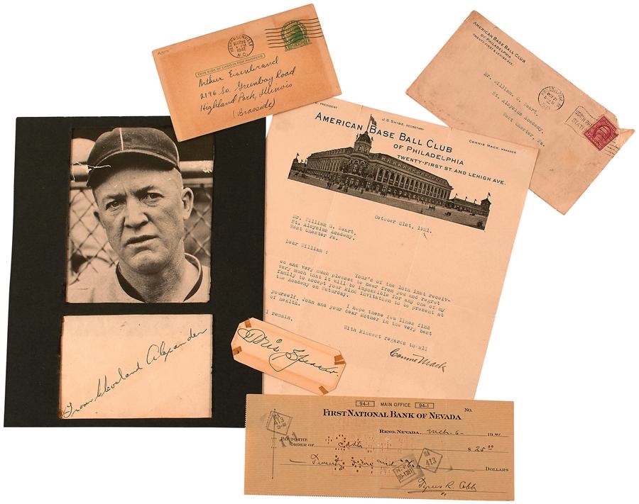The 1939 class was the first group of players inducted into the Baseball Hall of Fame and all members, including legends Babe Ruth and Cy Young, were in attendance for the induction Grand Opening. This lot features five hand-signed items of the original Hall of Fame members. First is a signed 1941 bank check of Ty Cobb. Second is a is 1921 typed letter signed by Connie Mack on his beautiful letterhead with photo of Shibe Park. Next is a full name signed of Grover Cleveland Alexander on an album page matted with 4.5" by 5.75" photo. The last two items are a Larry "Nap" Lajoie signed dated 3x5" government postcard and a Tris Speaker signed 1.5" by 3.5" cut signature. All signatures are in pen and average 7-8/10. Items average VG condition.