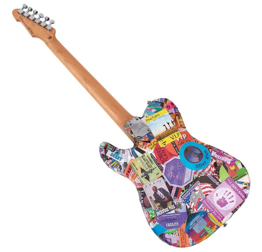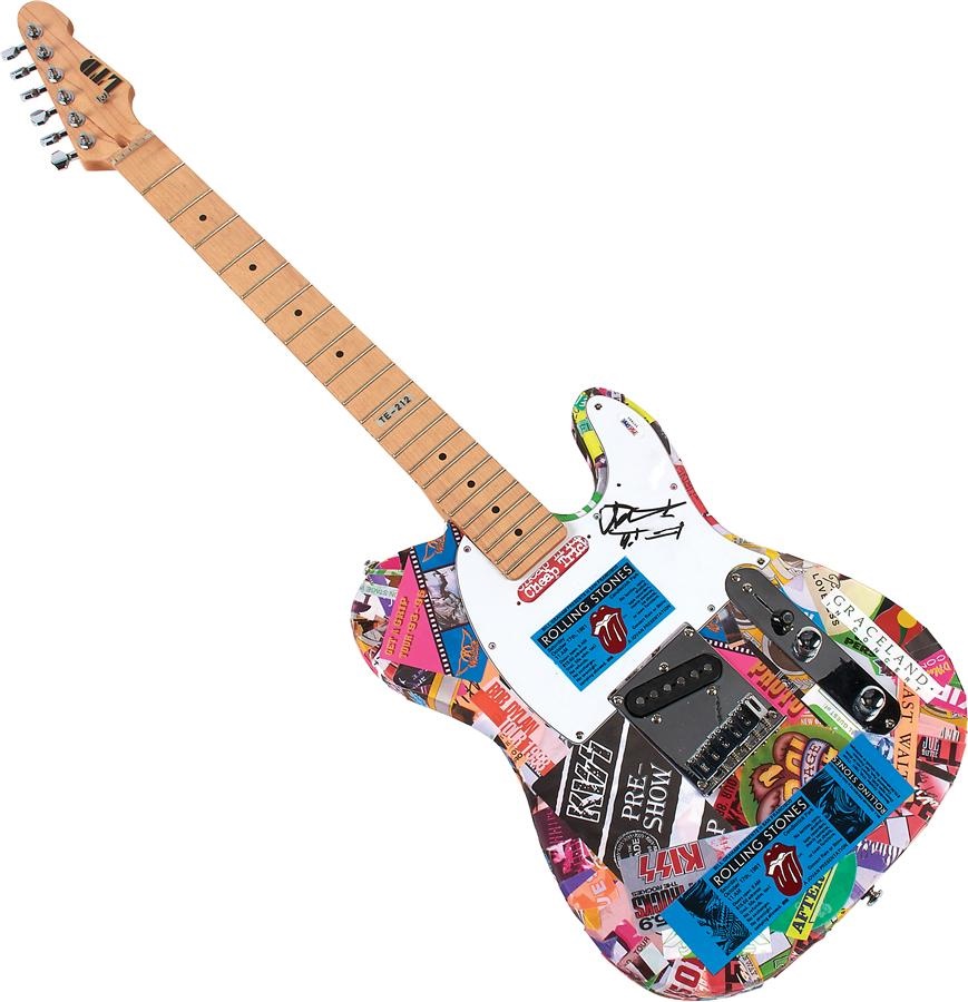 Created by our own Joshua Leland Evans, Chairman of Lelands.com, entitled Keith Richards First." This marvelous art piece is signed on the pick guard by the innovator Keith Richards of the Rolling Stones and is literally covered with a montage/collage of vintage backstage passes from the 1980s and 1990s. LTD guitar by ESP is plastered with a myriad of passes to give it a great look and represent the broad influence Lou Reed and the Velvet Underground had on all areas of popular music. Even the front neck is artfully done with portions of passes to create interesting "rows" of verse. Passes and even actual tickets from such bands as the Rolling Stones and many more. Autograph comes with PSA/DNA Authentication, this is one of less than than ten he has completed and is signed and dated by the artist with the title of the piece. All of the passes are 100% vintage originals obtained directly by Leland's from the archive of Otto Printing and Entertainment, the dominant force in printing concert backstage passes and tickets to this day.