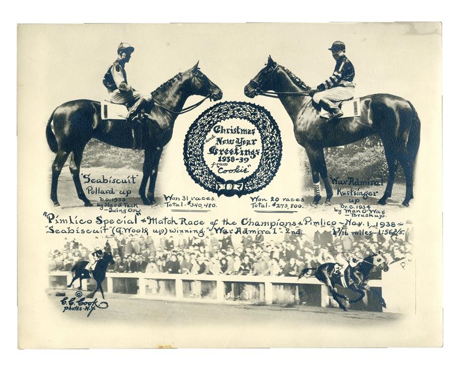 High quality, doubleweight, real photo Christmas card sent out to friends and clients by "Cookie," the famed photographer C.C. He selected the best photograph he took during the year and this one just happens to be Seabiscuit and War Admiral from the Match Race. Cook's original photographs are much sought after with this one especially coveted. A brilliant compendium of his photographs from his four decades was published, featuring mostly horses, but also including the likes of Jackie Kennedy who also favored him. C.C. Cook with NYC address stamped on back. In NRMT condition, measures 8.5x6.5".