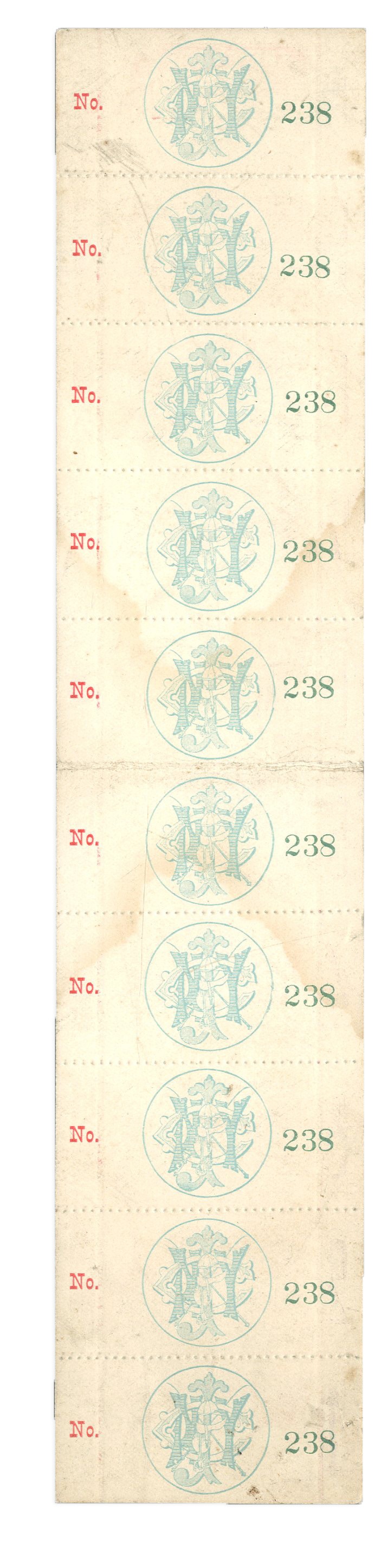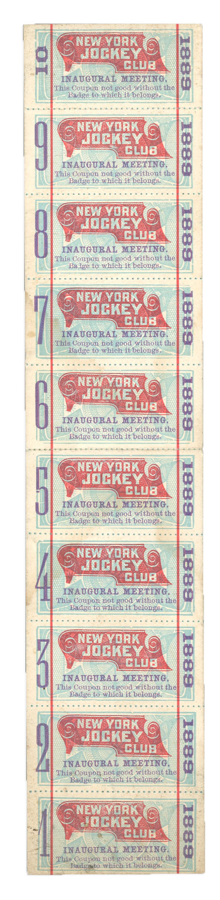 It is incredible that this has survived and is in this state. A strop of 1889 individual tickets, numbered 1-10, were for the Inaugural Meeting of Morris Park Race Track (New York Jockey Club) in the Bronx, New York. At the time it opened, Morris Park was acclaimed by the NY Times as the most modern and magnificent race track in the world. Opening on August 20, 1889, the ten-day meet ended on August 31, and all ten tickets are here and unmolested. All the top jockeys competed and some of the famous horses ran: Hanover, Firenzi, Kingston (won four at meet) and Tenny (won three races at meet). Extremely rare and NRMT ticket strip is unique in this attached format); we have never even SEEN another single ticket for this inaugural meeting, let alone a complete strip.