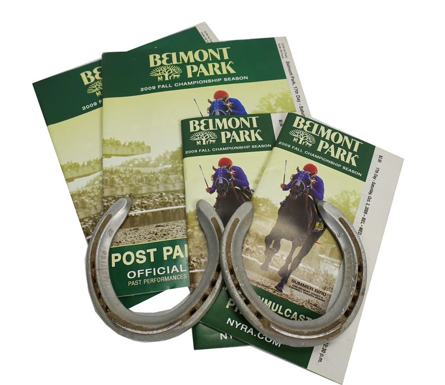 Featured in this lot are two rear horseshoes worn in the Jockey Gold Cup at Belmont in 2009. Quality Road (ridden by John Velasquez) ran 2nd to Summer Bird on a sloppy track. Included are photographs of Quality Road wearing the horseshoes at Belmont in 2009. There are also two programs and simulcast programs from the race. Comes with rock-solid documentation stating these were obtained directly from Jose Estrada, personal assistant to Quality Road's farrier, Ray Amato.
