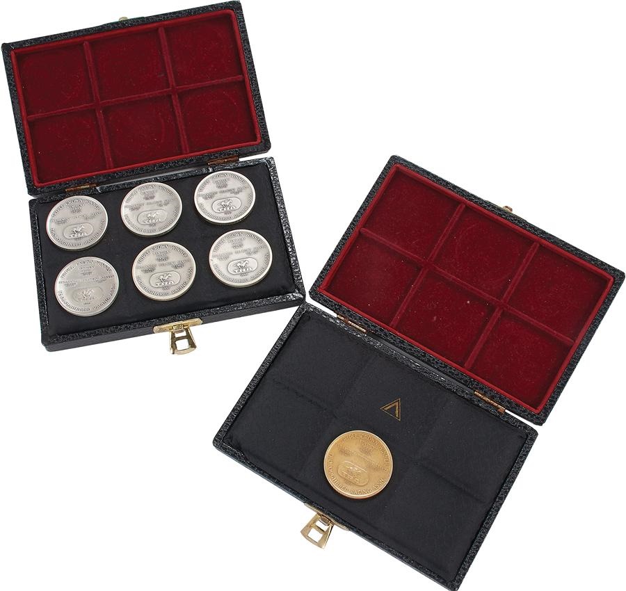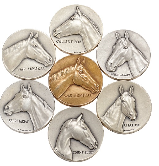 When this extremely rare set of limited edition Triple Crown coins was made, there were only nine Triple Crown winners. Offered is a lot of (6) coins from the silver set including Whirlaway, Citation, Count Fleet, War Admiral, Gallant Fox and Secretariat along with one War Admiral coin from the 24k gold on silver set. Each silver coin was made by MACO and features .999 fine silver and weighs 1.3 ounces. Every set was engraved with a serial number on the outside of each coin, and the silver coins are from set number 117. The gold coin is .999 silver with 24kt gold overlay from set #343 weighing 1.35 ounces. The back of each coin has the stats from each Triple Crown victory as well as the year. This is a very hard item to find and there are not many in circulation.