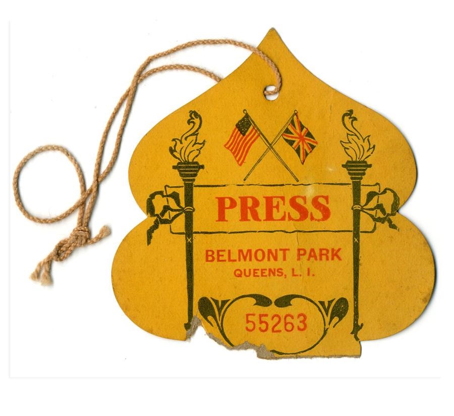 Nearly impossible to find, this October 20, 1923, cardboard Zev-Papyrus press pass originates from this $100,000 wonder from Belmont Park. Red and blue colors are still very impressive and torn at the bottom from when the stub was removed.
