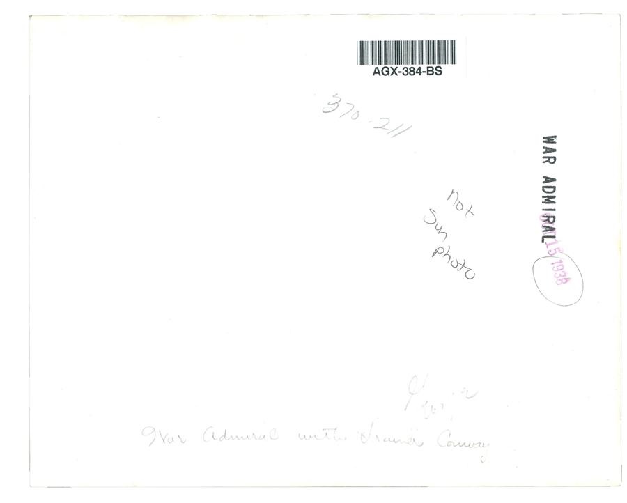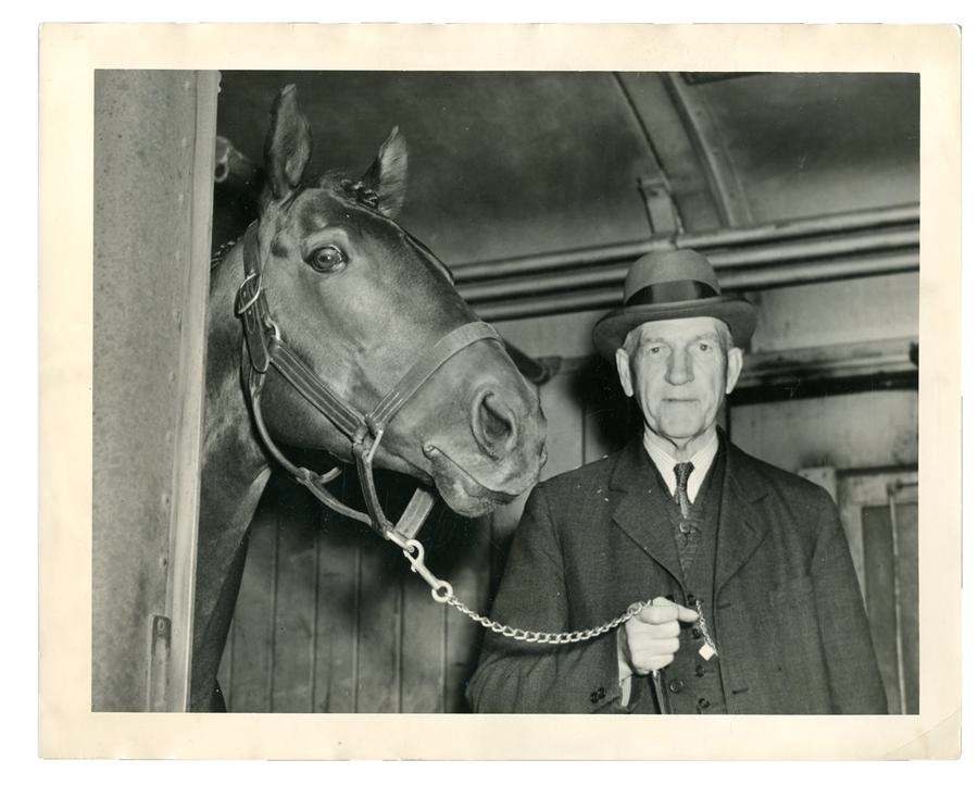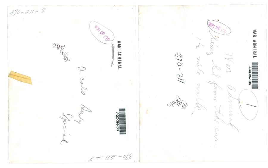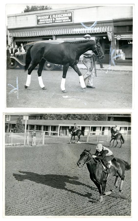 Three glorious Type 1 wire photos from October of 1938, featuring the famed War Admiral readying himself for the world famous match race versus Seabiscuit. Includes a majestic pose, being led from the truck and with trainer George Conway. Overall EX, one with editor's marks.