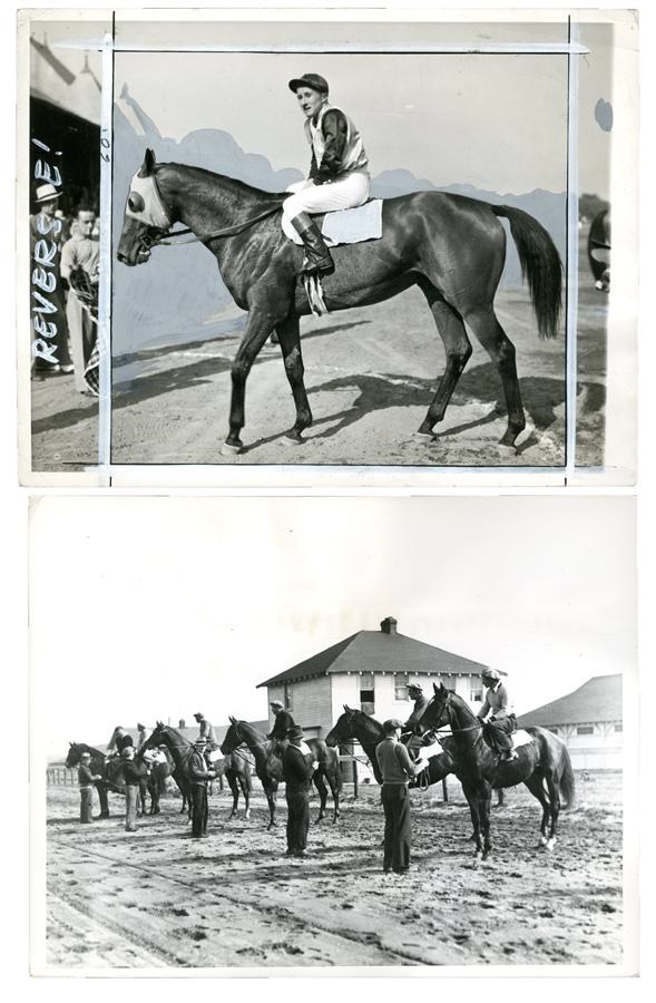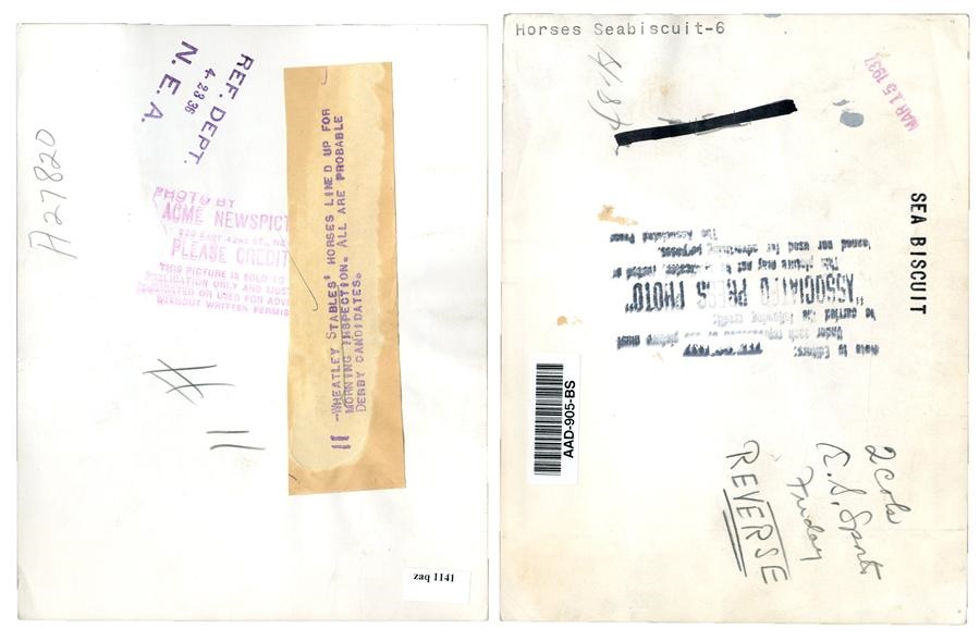 Featured is an extremely rare pair of some of the earliest photographs ever taken of Seabiscuit. These Type I wire photos date back to 1936-37 and measure 7x9". Sparkling imagery includes April 23, 1936, lined up at Wheatley Stables for morning inspection before Tom Smith ever laid eyes on him. Second is from March 15, 1937, (editor's marks) extremely early in his career. In EX-MT condition.