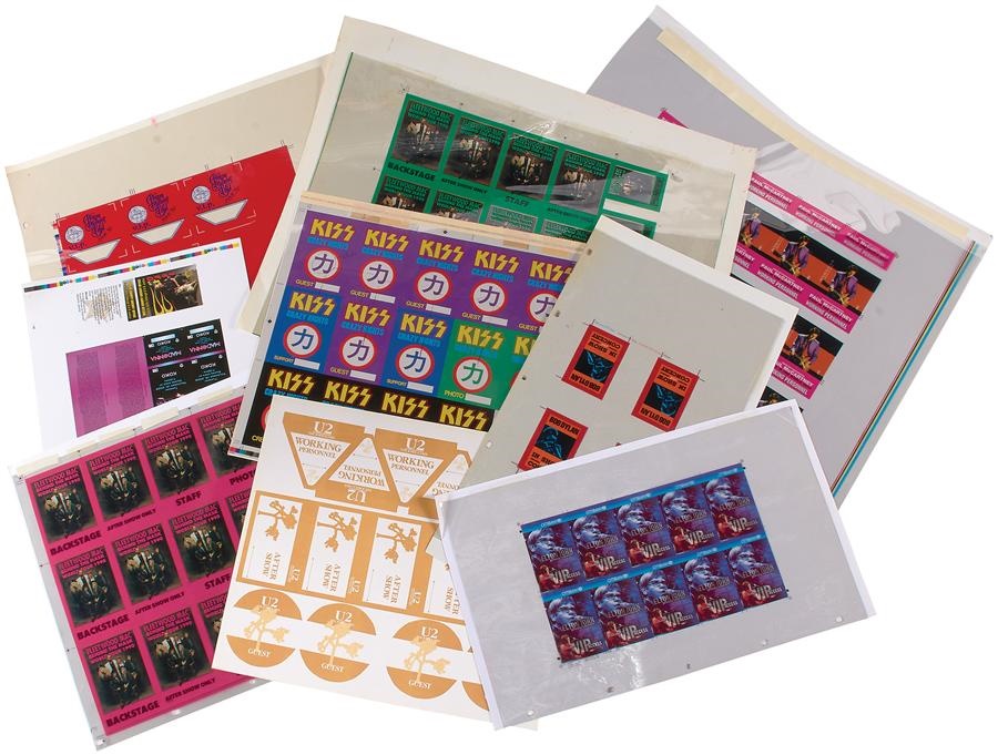 An incredible collection of backstage pass original art and uncut sheets, this lot features original art (color transparencies used to print final product): 1994 Allman Brothers, KISS Crazy Nights, 1990 Fleetwood Mac "Behind the Mask" (two different), 1995 Jimmy Page & Robert Plant "World Tour," 2003 Paul McCartney "Back in the World," Elton John "Private Concert," 1997 Bob Dylan In Show & Concert. Plus, 1987 U2 "Joshua Tree" uncut sheet, of backstage passes and 2005 Madonna 2005 KoKo uncut ticket proof sheet, both used to proof final products. All were obtained directly from Otto Printing and Entertainment, who still produces the passes and tickets to this day.