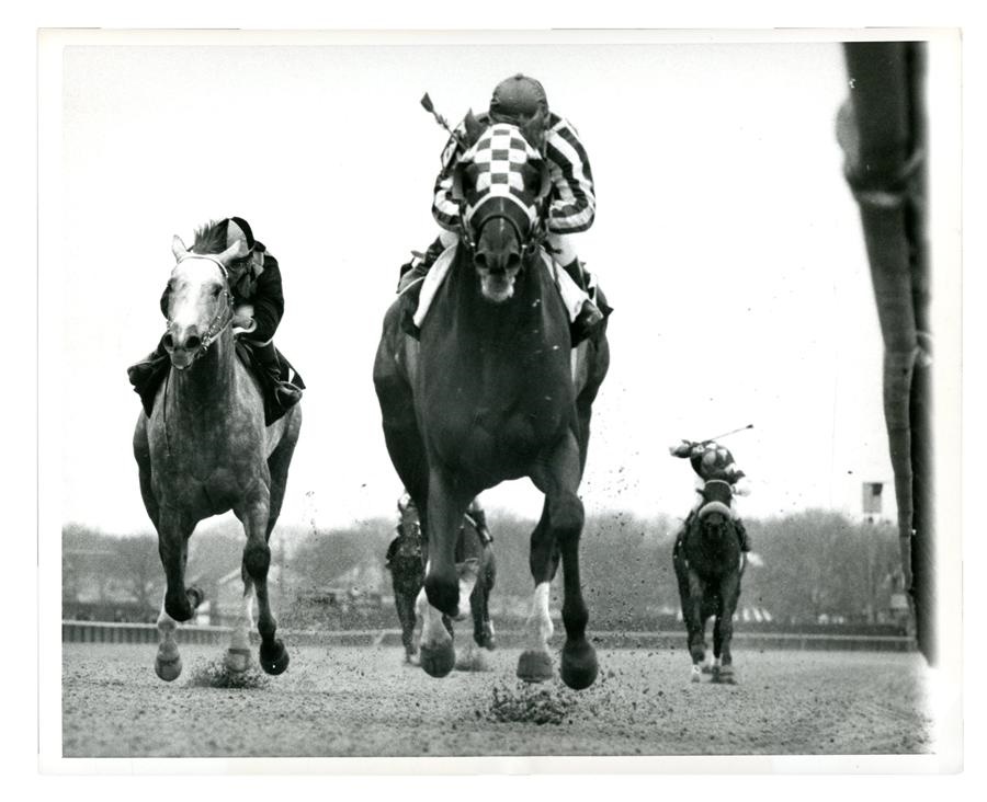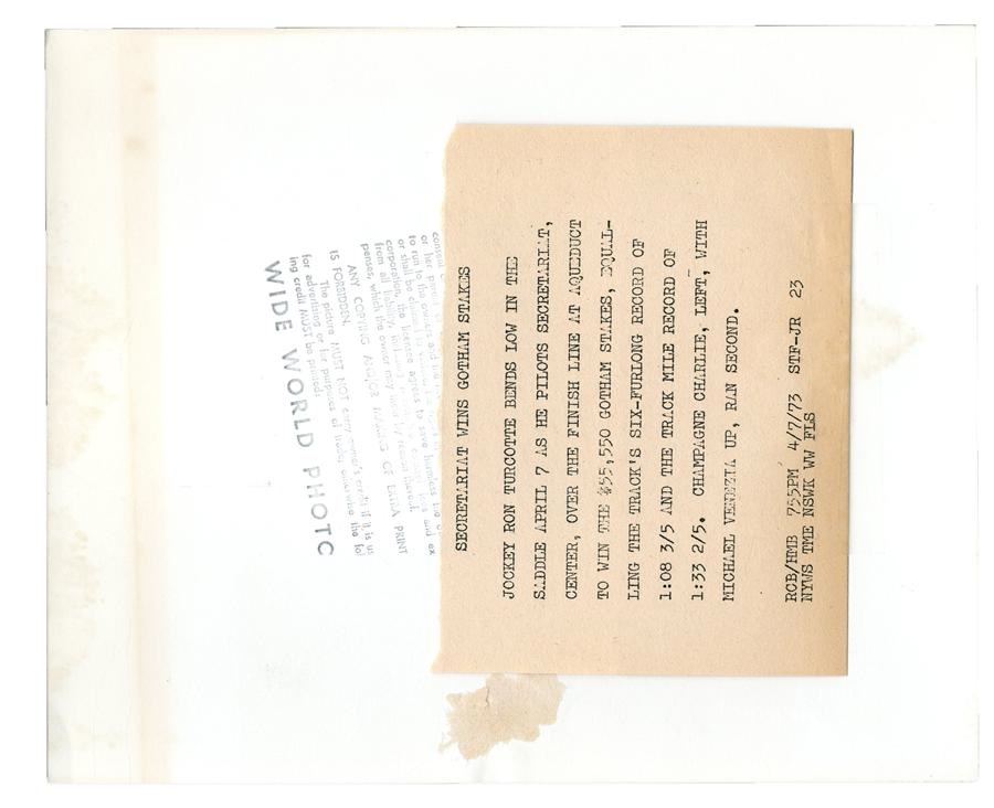 This killer image of Secretariat's greatest triumph is a Type I press photo with paper caption on verso describing this incredible feat. Measures 8x10".