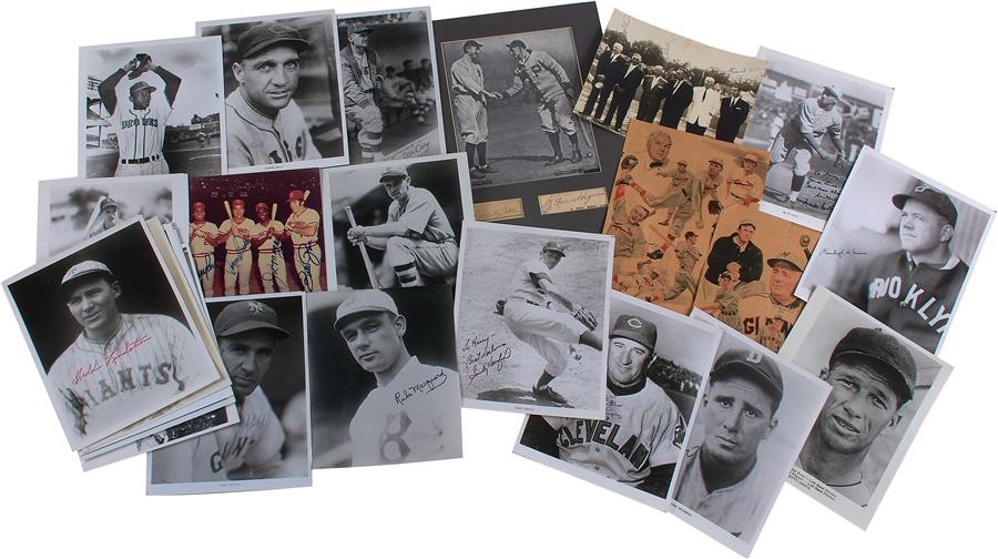 A tremendous array of signed photos and more is included in this lot, featuring about 70 items. The majority are black and white 8x10" photos and some are personalized, though the majority are not. Most are Hall of Famers with the exception of a few more recent photos that are multi-signed. In addition to the signed photos, there is a display with cuts of Ty Cobb and Honus Wagner (pencil), as well as magazine pages with Cardinals greats including Bottomley and Hornsby and one page of NY Giants greats with signatures of Ott and Hubbell. Also included is a multi-signed photo of the 1955 Hall of Fame induction with signatures of DiMaggio, Vance, Baker and Schalk. Others include Mantle (personalized), McCarthy, Haines, Lindstrum, Hooper, L. Waner, Marquard, Paige, Hubbell, Koufax (personalized), Lopez, Grimes, Grove, Hoyt (personalized), Greenberg (personalized), Terry, Kelly, Carey, Rousch, Ruffing, Averill, and many more. The signatures average 7/10 and photos themselves average VG-EX condition.