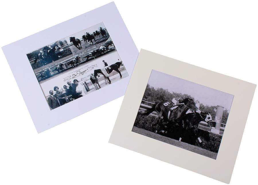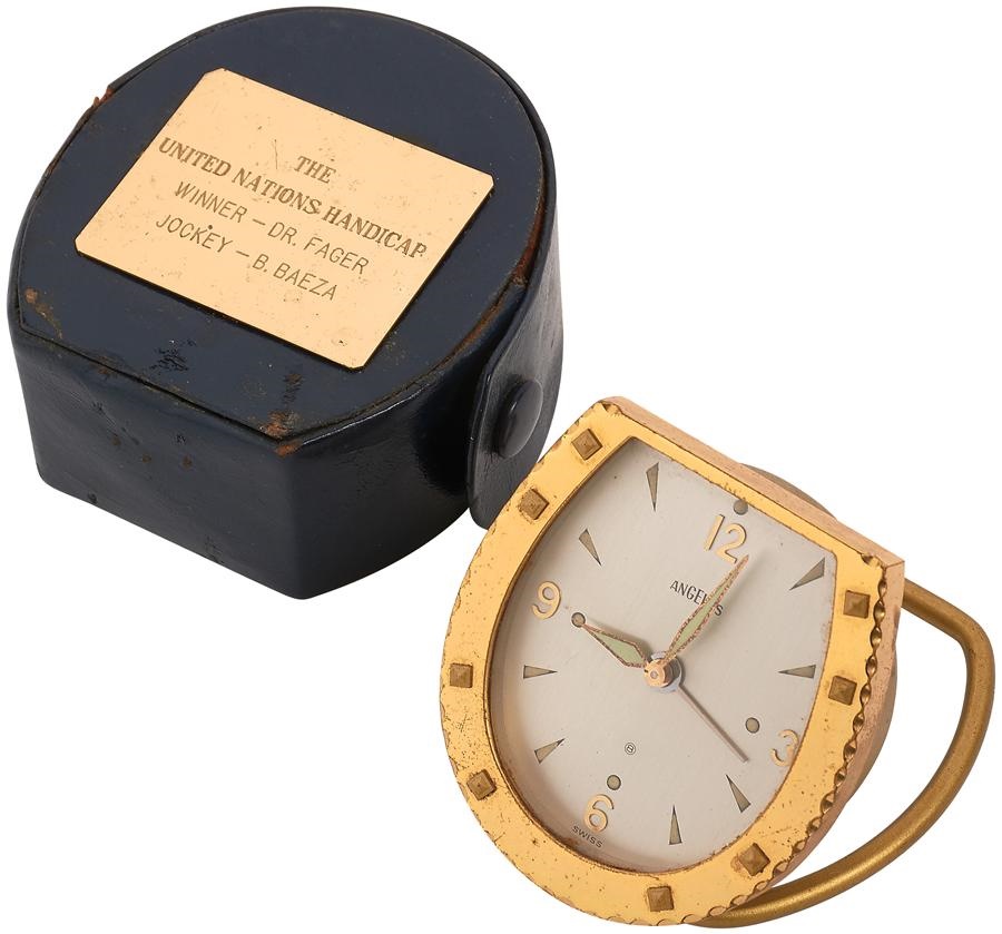 He is the only horse to ever hold four titles in one year. In 1968, Dr. Fager was singled out as Horse of the Year, champion handicap horse, champion sprinter, and co-champion grass horse. That is attributable to what many consider one of the greatest single racing seasons by any horse in the history of the sport. In the 1968 United Nations, his only race on turf ever, Dr. Fager defeated reigning turf champ, Fort Marcy, and set the world record at 1 mile on any surface: 1:32 1/5, achieved on August 24, 1968, when he ran in the Washington Park Handicap at Arlington Park. Here's the presentational clock designed in a horseshoe shape that was awarded to the winning jockey, Braulio Baeza, who signed the inside flap. It comes in its original case with a gold-plated plaque that reads: "THE UNITED NATIONS HANDICAP WINNER - DR. FAGER JOCKEY - B. BAEZA." The clock is 2.5" wide and is currently not functional. The lot includes two photos from the race.