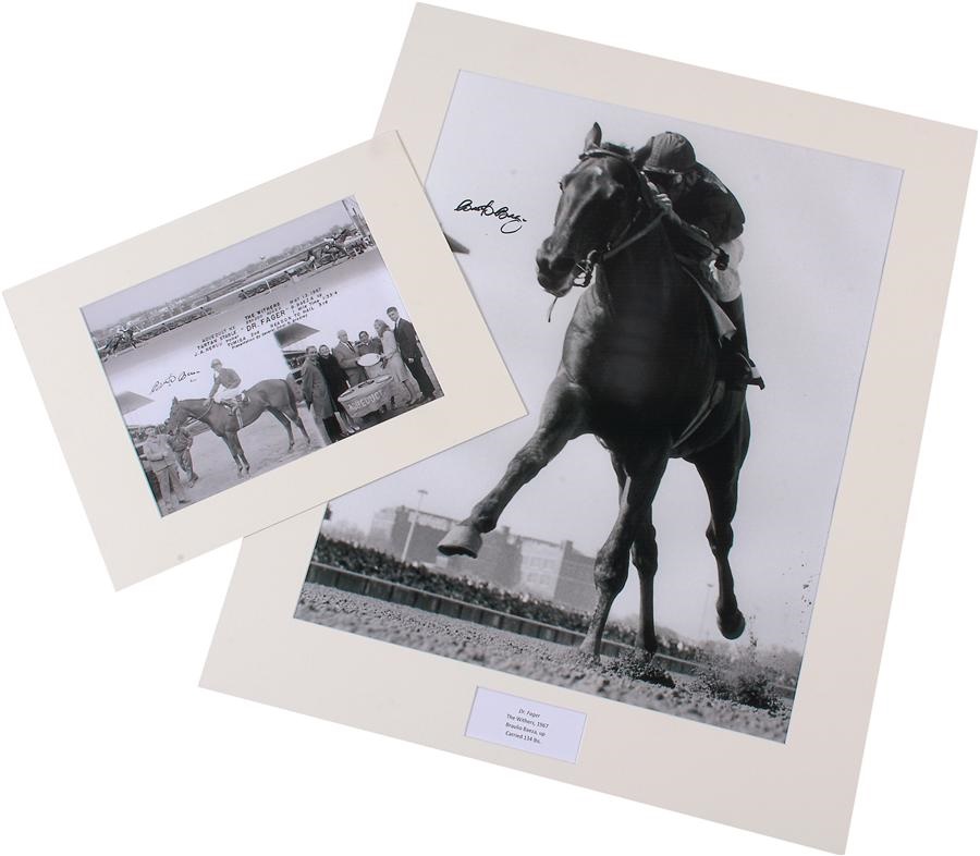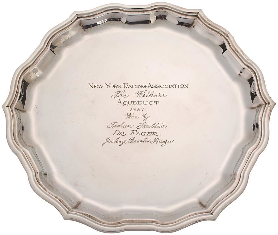 In this race, Dr. Fager set a race record in the Withers, carrying an assigned weight of 134 lbs. in 1:33 4/5, the fastest time in the history of the race up to that point. Baeza, who signed two photos that are included in this lot, said he could have had Dr. Fager go faster, but knew he was far in front of the rest of the field and didn't want to tax the horse unnecessarily. He authored one of the greatest racing years a horse has ever had as, in 1968, Dr. Fager earned four titles, collecting a string of successes. Leading up to that phenomenal year, he took home the top prize in the Withers Stakes in New York, for which he earned this 10"-wide ceremonial tray. It is engraved; "NEW YORK RACING ASSOCIATION THE WITHERS AQUEDUCT 1967 WON BY TARTAN STABLE'S DR. FAGER JOCKEY: BRAULIO BAEZA."