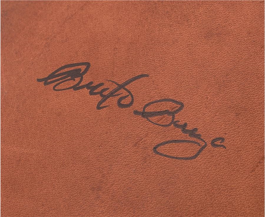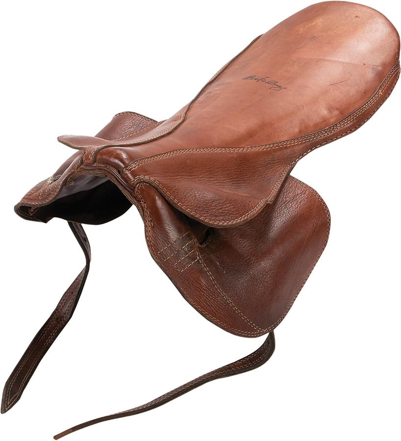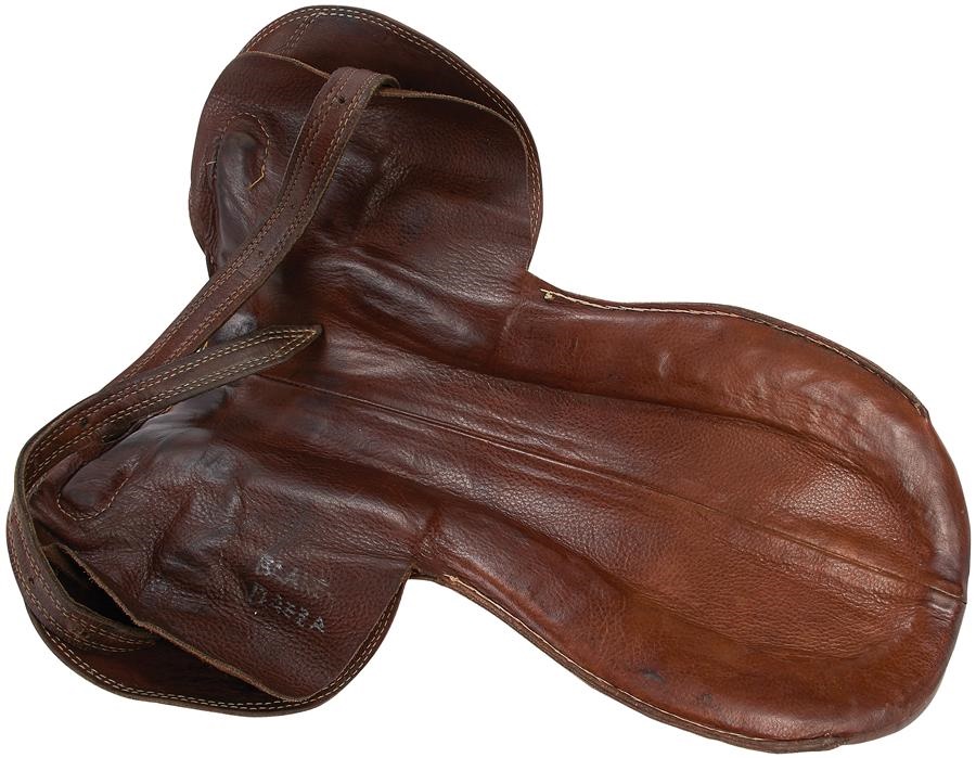 Hall of Fame jockey Braulio Baeza used this saddle at the end of his 22-year career, and it was the last last one he used on his work-a-day horses. He was the winner of 3,140 races in the United States and 873 in his native Panama for a lifetime total of 4,013. Baeza retired during the Saratoga meet in 1976 because making weight became too difficult. Standing at 5'5" - a relative giant in the jockey world - it is no secret he had to reduce hard in order to ride races at all, as most jockeys stand anywhere from 4'10" to 5'2". This saddle helped him make weight on those horses who were not entered in Stakes, but in the lesser races. Stakes horses usually carry above 120 pounds, whereas claiming horses, at that time, could carry as light as 105-110 pounds. This saddle, which he boldly signed, was very important to Mr. Baeza in that it allowed him to stay competitive in the claiming races while keeping his strength up.